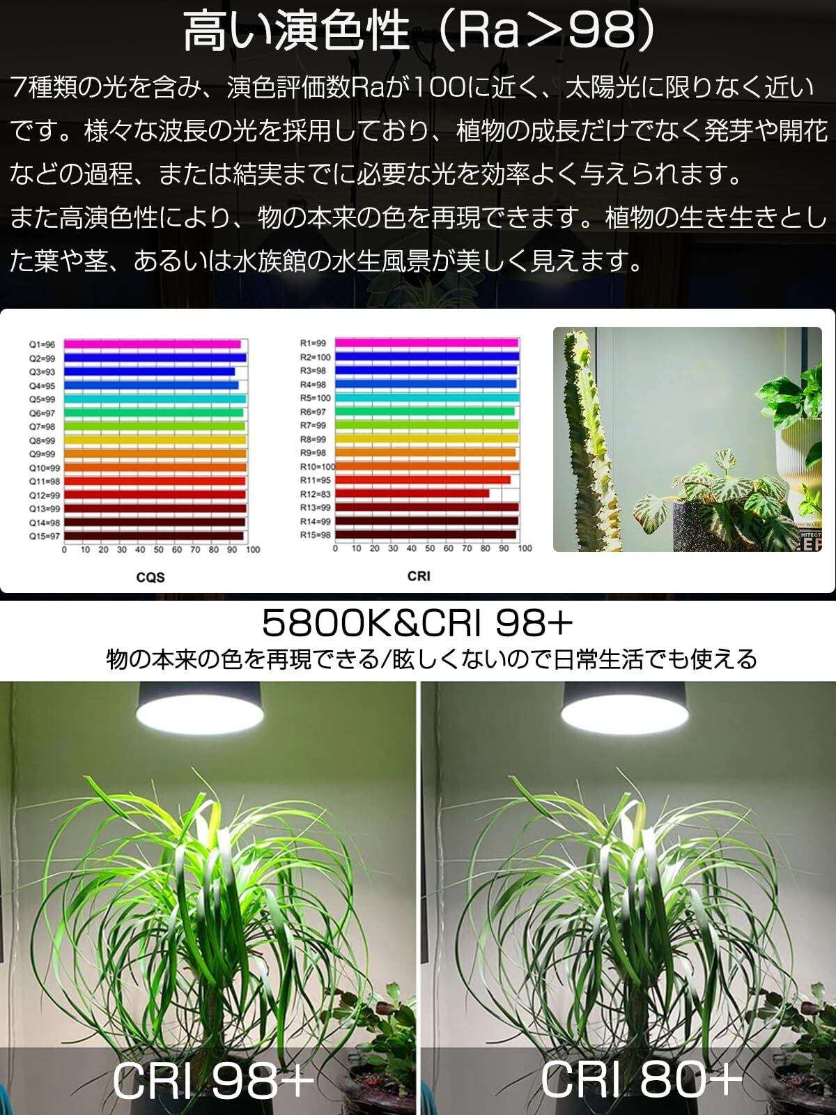 ꕥ【高演色性(Ra>98)で実現できる高い鑑賞性】植物を育てる上で、いきいきと生育・維持させるためにはほとんどの植物が太陽光に近い光を必要とします。演色性評価数(Ra>98)のCOBを使用し、植物のもっとも綺麗な色を映し出します。光を正しく放射することでお外で光合成させてあげることと同じように植物の光合成効率を向上させ、植物はより速く成長し健康的で豊かな色合いを持つことができます。