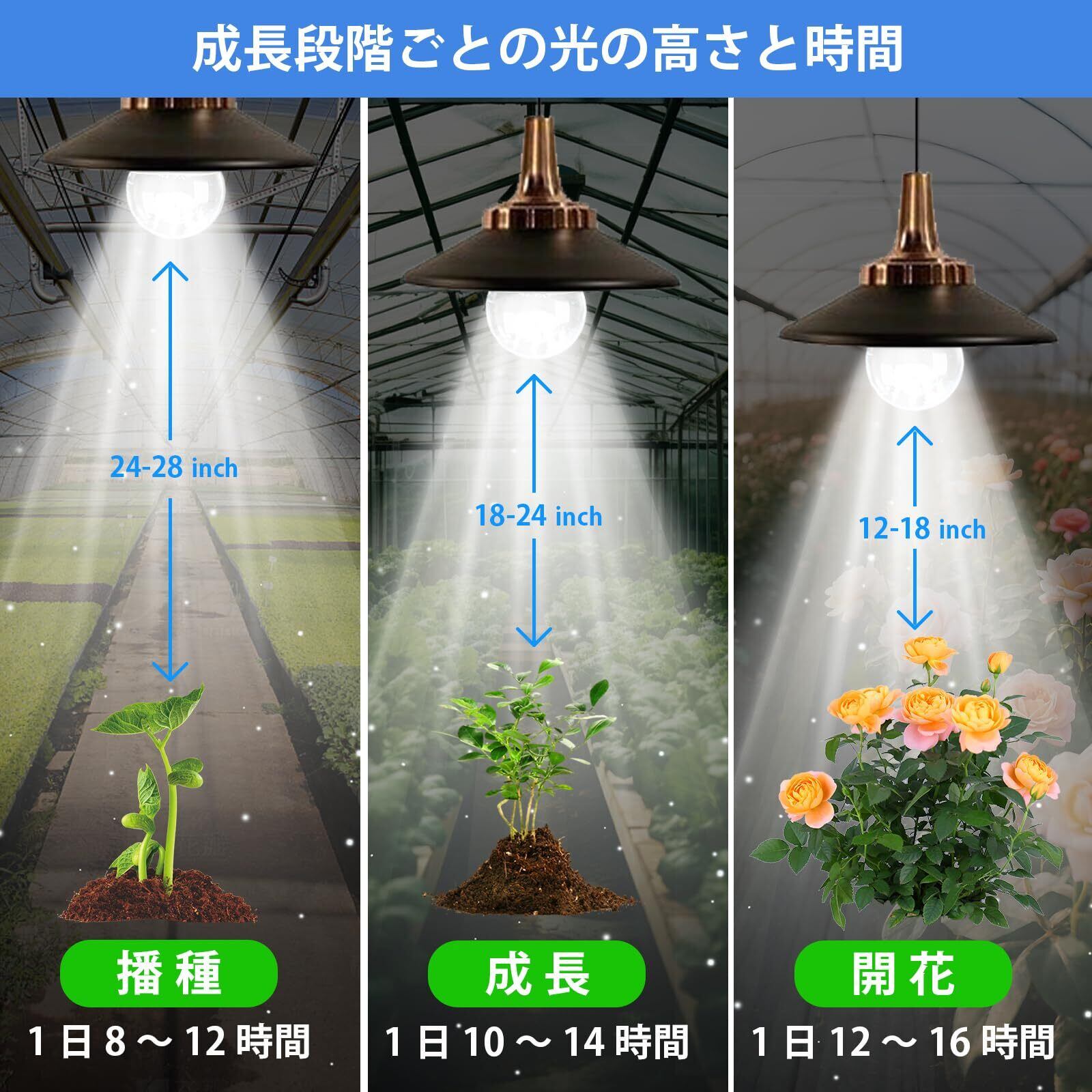1. フルスペクトル自然光ライト:4000K白色光に赤・青スペクトルを配合。トマト、キュウリ、葉物野菜からハーブまで、あらゆる植物の成長段階に最適です。
