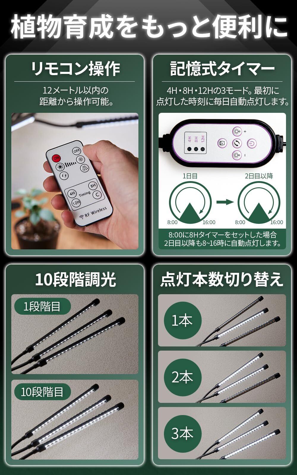 【植物育成をもっと便利に】●リモコン操作可能:12メートル以内の距離から操作可能。●記憶式タイマー:4H・8H・12Hの3モード。最初の点灯時刻に毎日自動点灯。●10段階調光:1〜10段階まで調光可能。●点灯本数切り替え:1・2・3本と点灯本数の切り替えが可能。