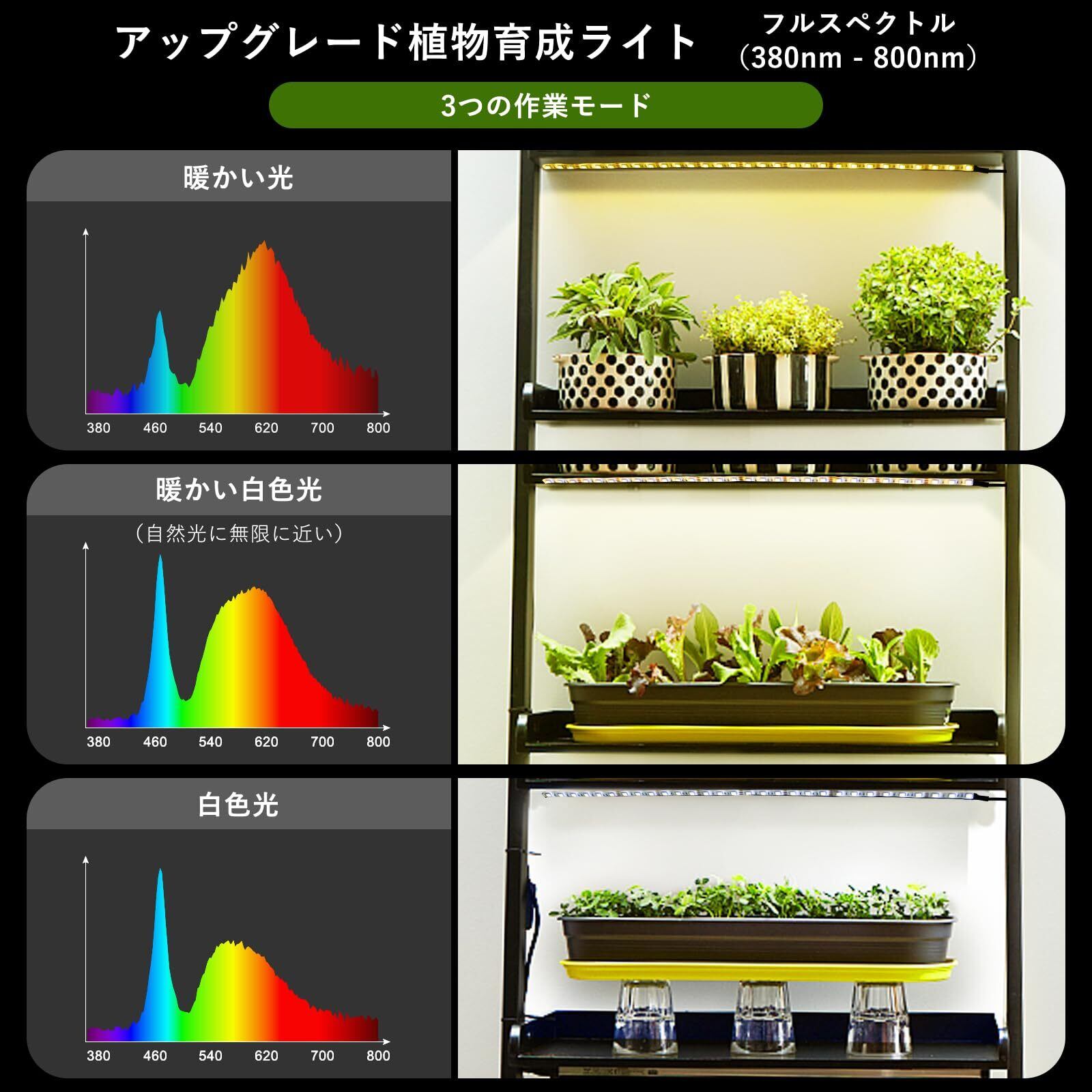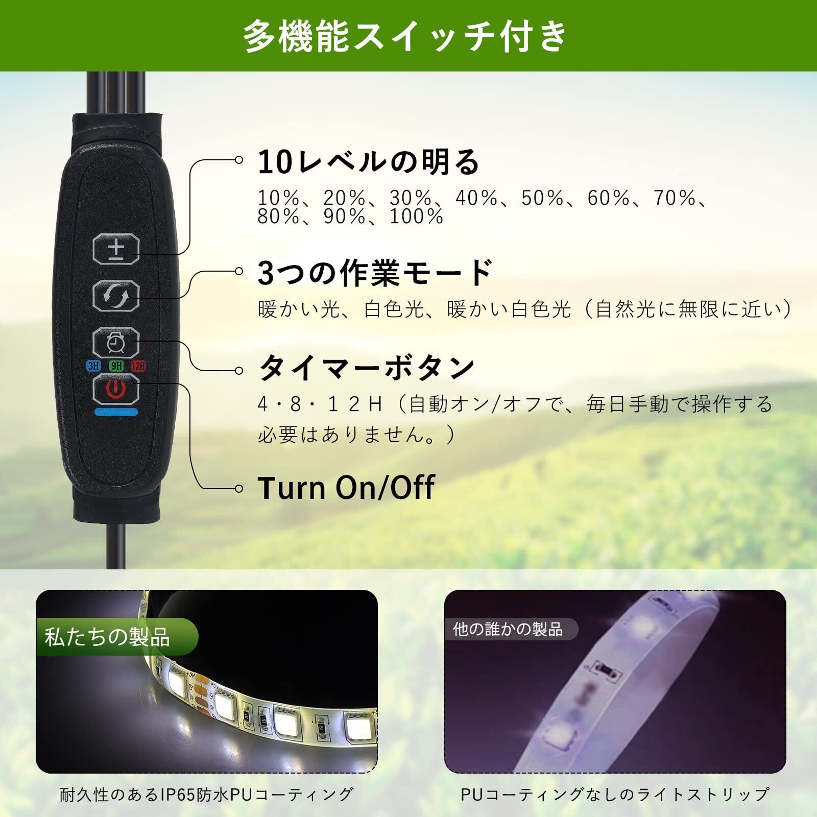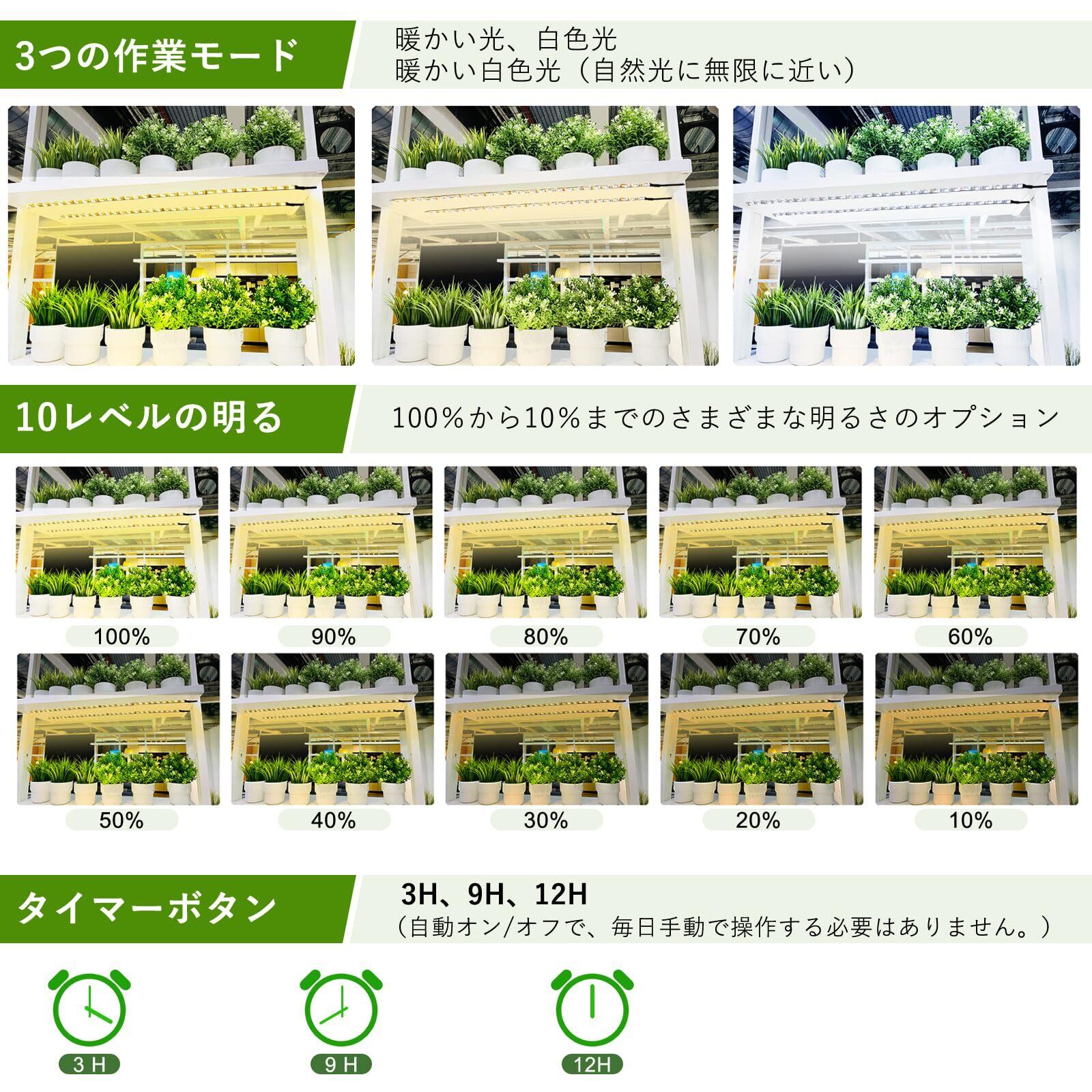【タイマー機能 & 24時間サイクル】植物ライトは3/9/12Hタイミングに対応しており、留守中でも消費電力の心配がない。もし電源切れましたらもう一度タイマー時間設置必要です。操作は簡単で、日本語の取扱説明書がついています。