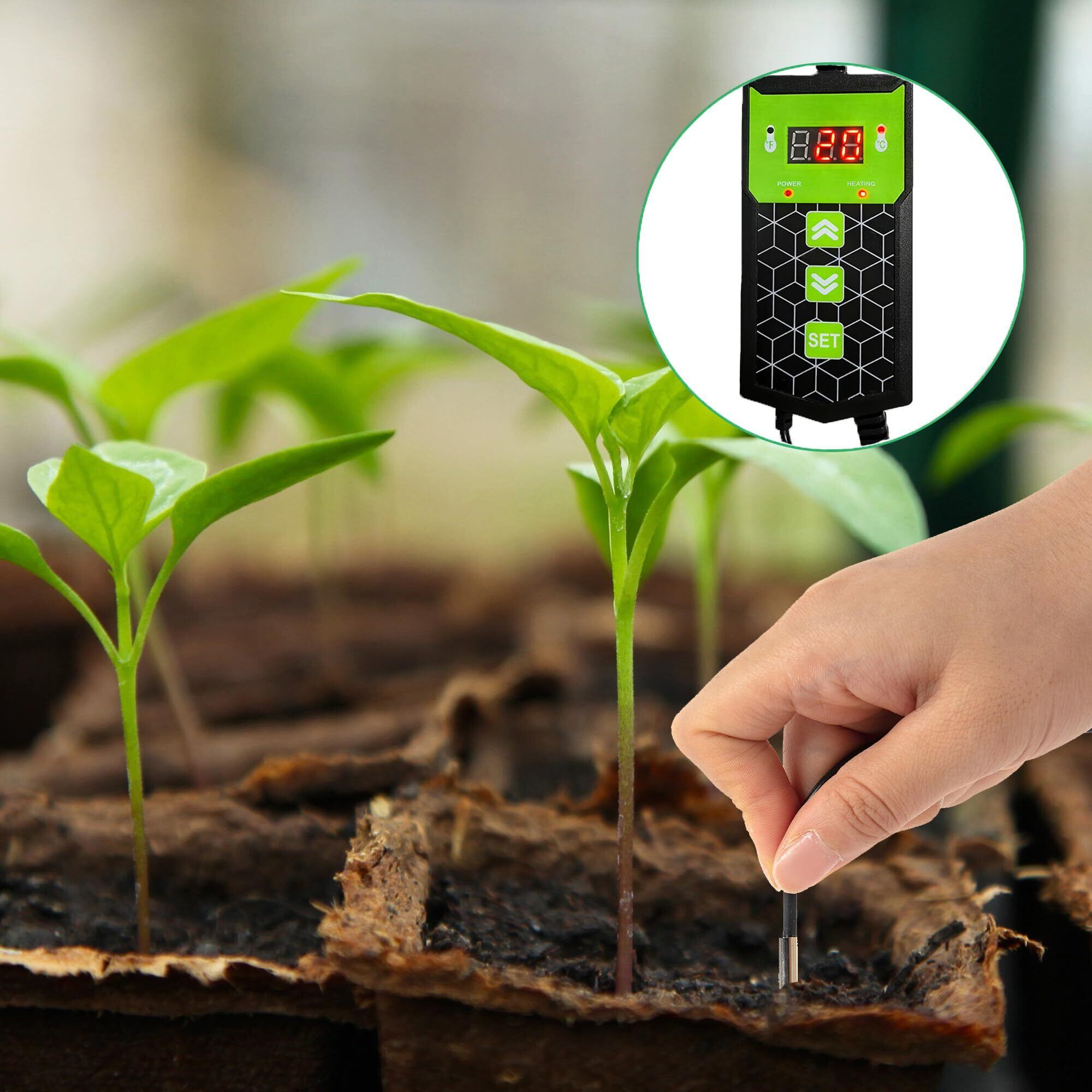 4.植物のヒートマットはセンサープローブが付属しています。プローブを土壌に挿入することで温度を感知することができます。目標温度に合わせて電源をオンまたはオフにします。
