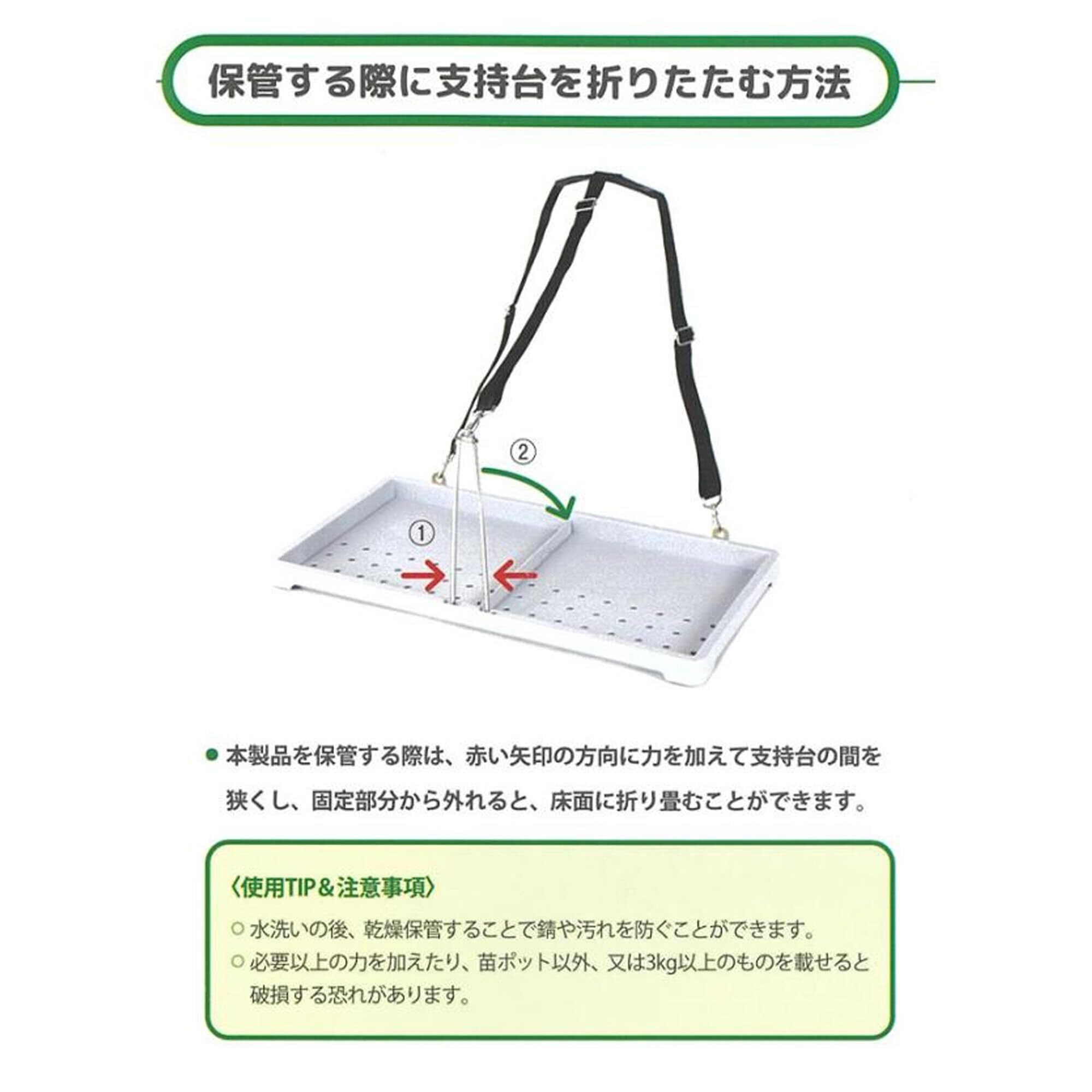 三つの肩ひもが苗トレーの重さを分散させ、身体の疲労を最小限に抑えます。