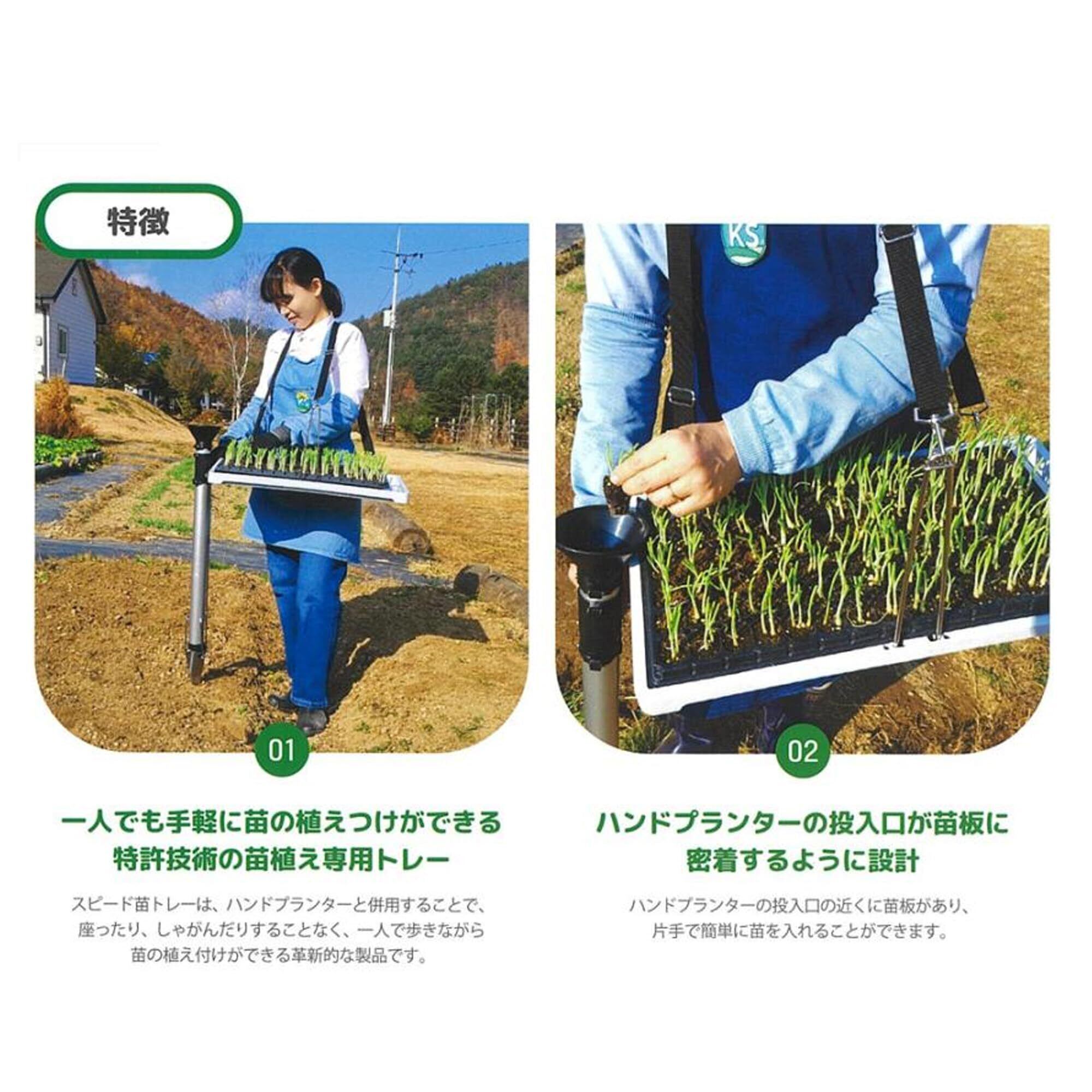スピード苗トレーは、ハンドプランター(別売)と併用することで、座ったり、しゃがんだりすることなく、一人歩きながら苗の植え付けができる革新的な製品です。