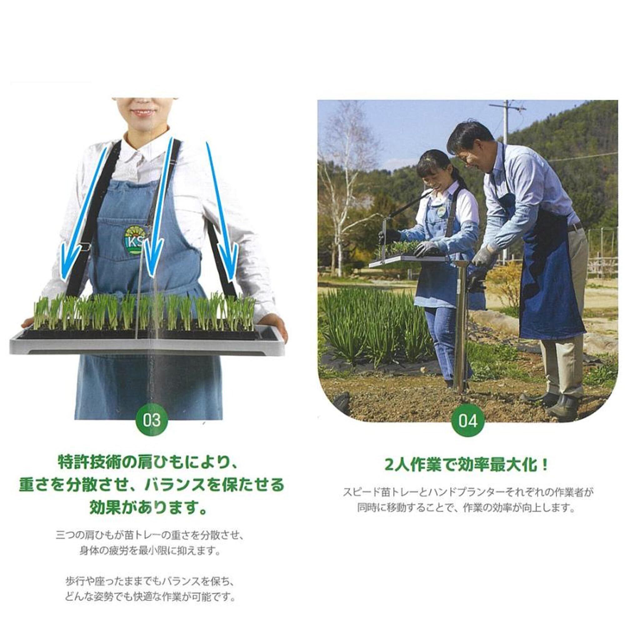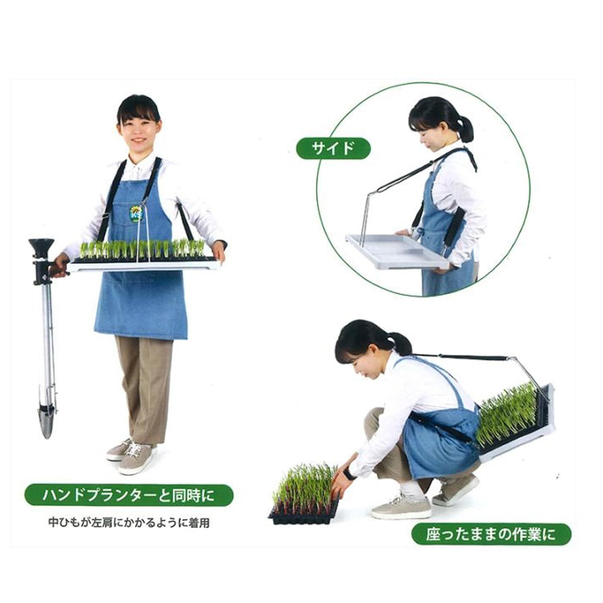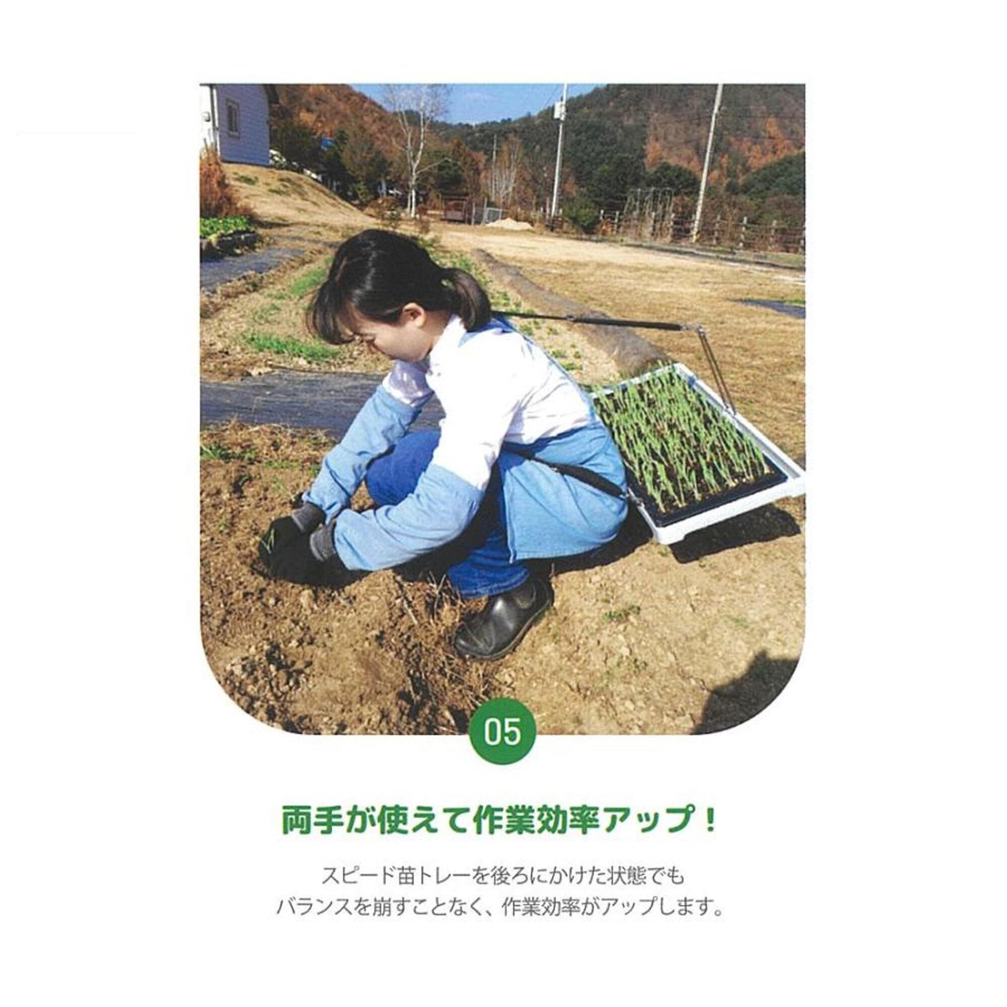 軽く肩にかけて腰が伸ばせる、一人でも手軽に苗の植え付けができる専用苗トレー。