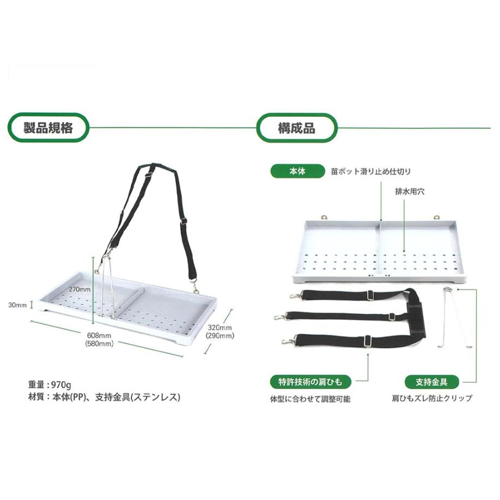 ・機能:[本体] 排水穴、苗ポート滑り止仕切り [連結支持台] 紐ズレ防止クリップ [三角錐肩紐] 体型に合わせて調節可能