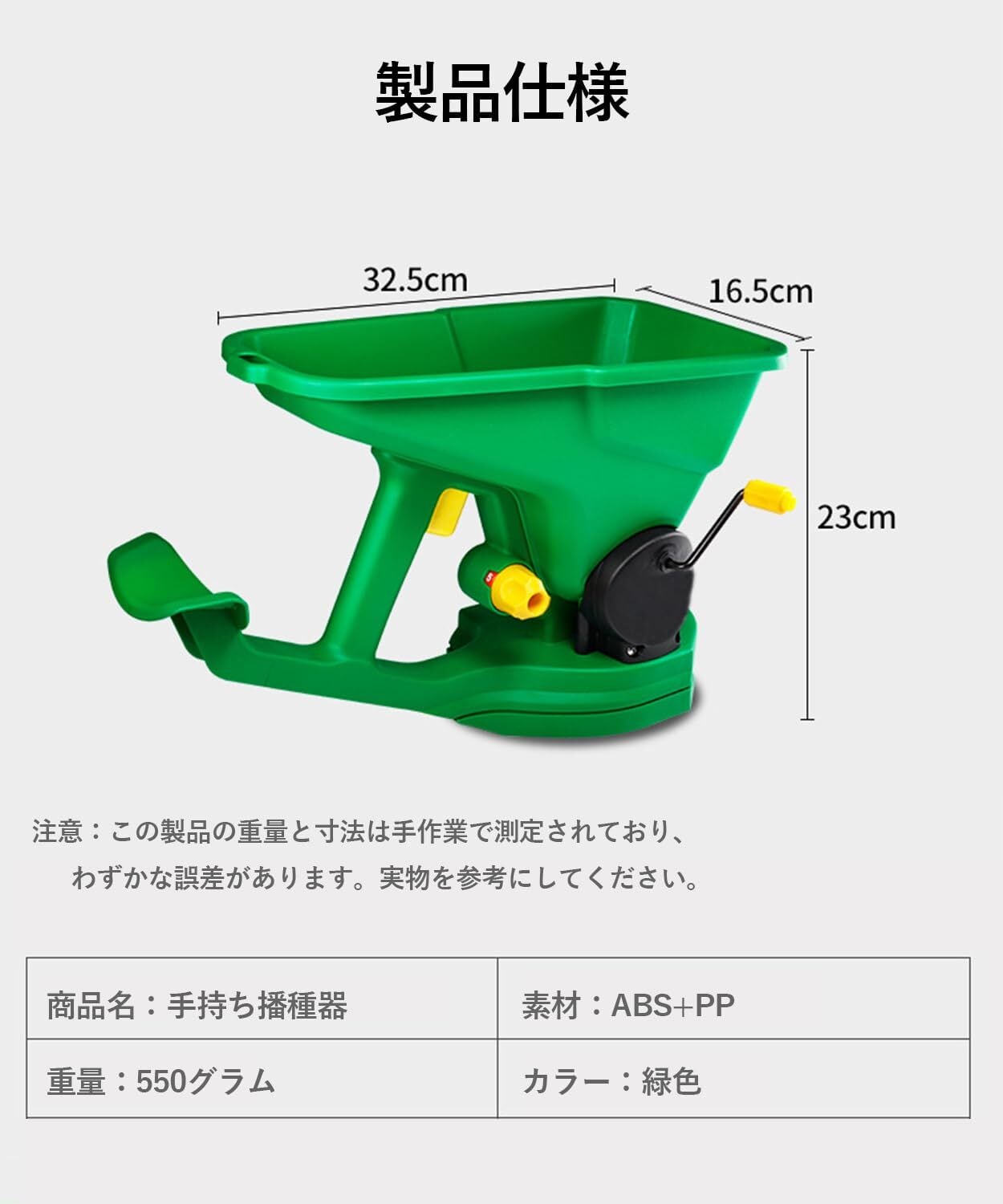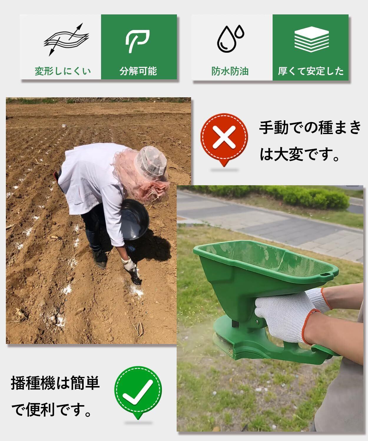 手動クランク設計、操作が簡単:手動クランクの金属ハンドル設計により、操作が非常に簡単で柔軟です。長時間使用しても疲れにくく、播種作業が時間と労力を節約できます。家庭や小型農場での使用に最適です。