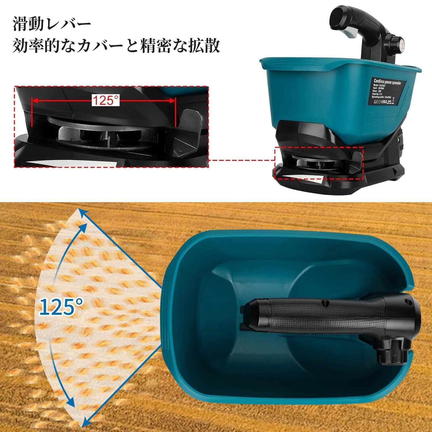 【効果的な散布】散布口にパドルを装備したこの芝生用種まき機は、扇状の範囲で小さな粒子を均等に分布させることをします。最大散布角度125°で、効率的なカバレッジと精密な散布がされ、より健康で活気のある芝生が実現します。