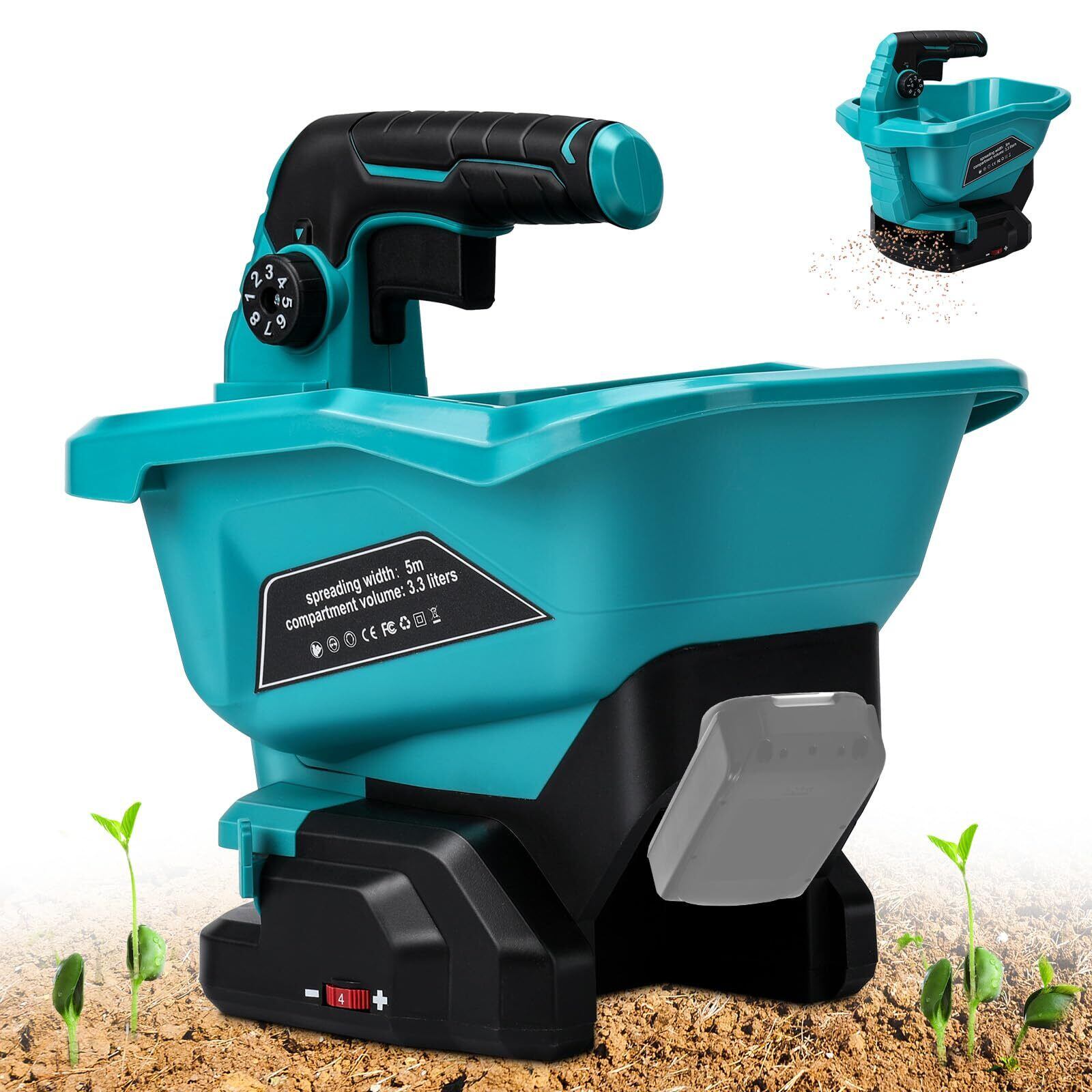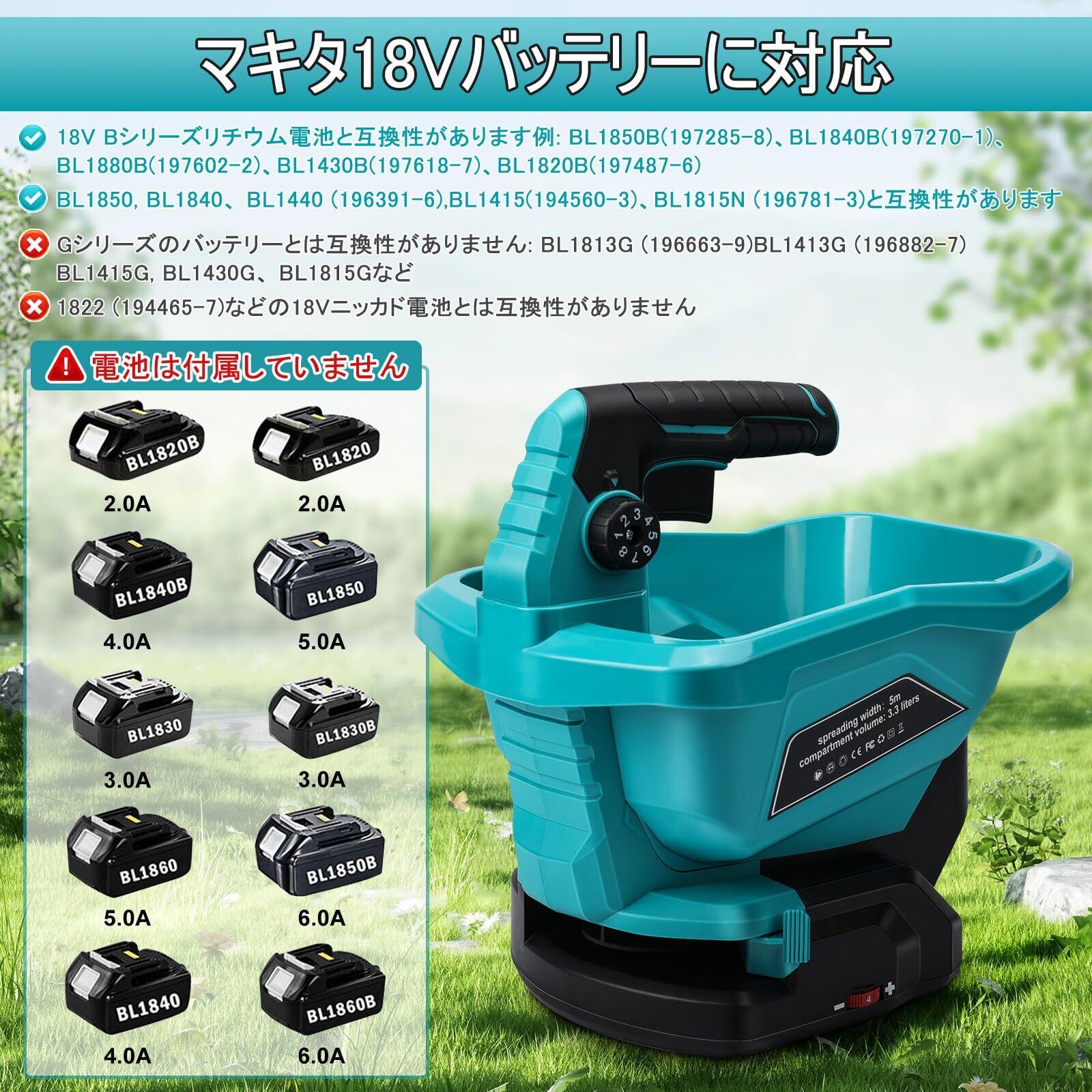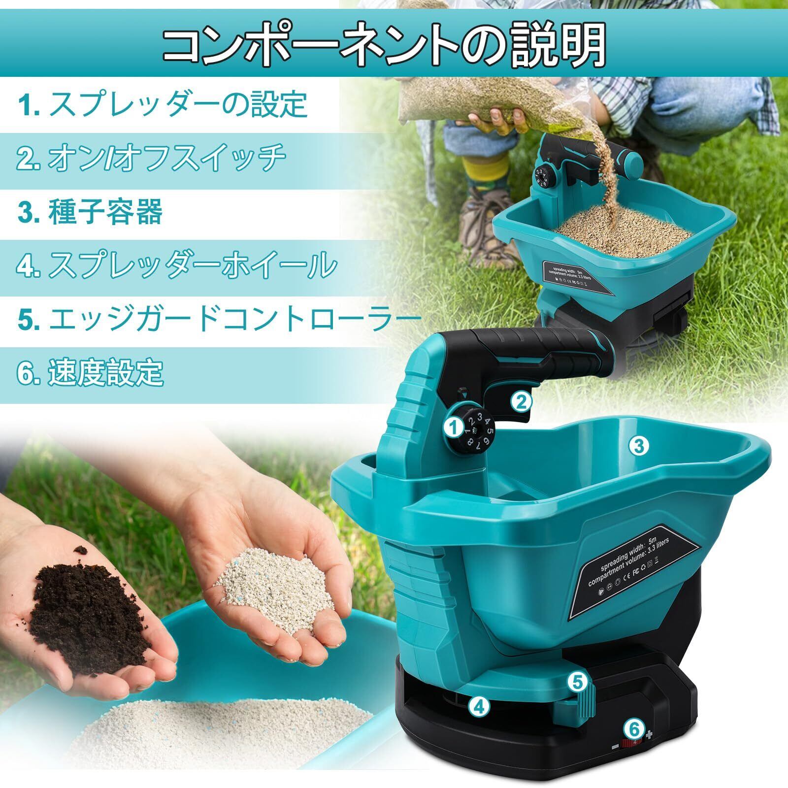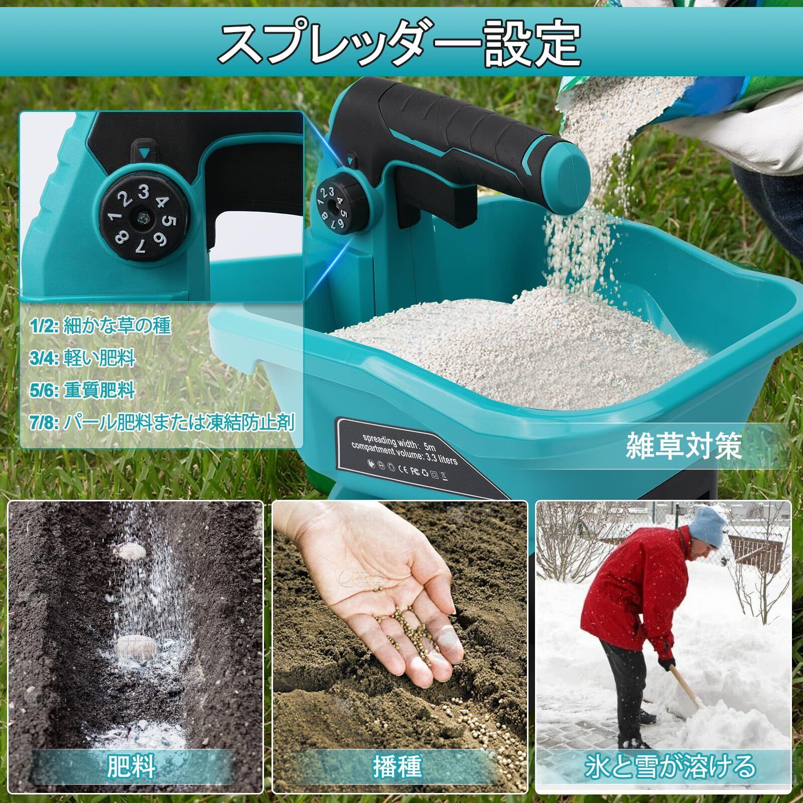 bumxca 散粒機 電動散粒機 充電式播種機 肥料散布機 散布機 種まき機 【6段階速度調整 8段階角度調整】融雪機 マキタ18Vバッテリー対応 最大散布角度125° 容量3.3L 長時間作業可能 均一散布 精密散布 一年中使える 種子散布機 播種機 芝生用種まき機 アームレスト付き 手持ち式 芝生ケア 生産能力向上 除草剤 融雪剤 飼料 目土 日本語取扱説明書【本体のみ バッテリー別売り】 | KSショップ