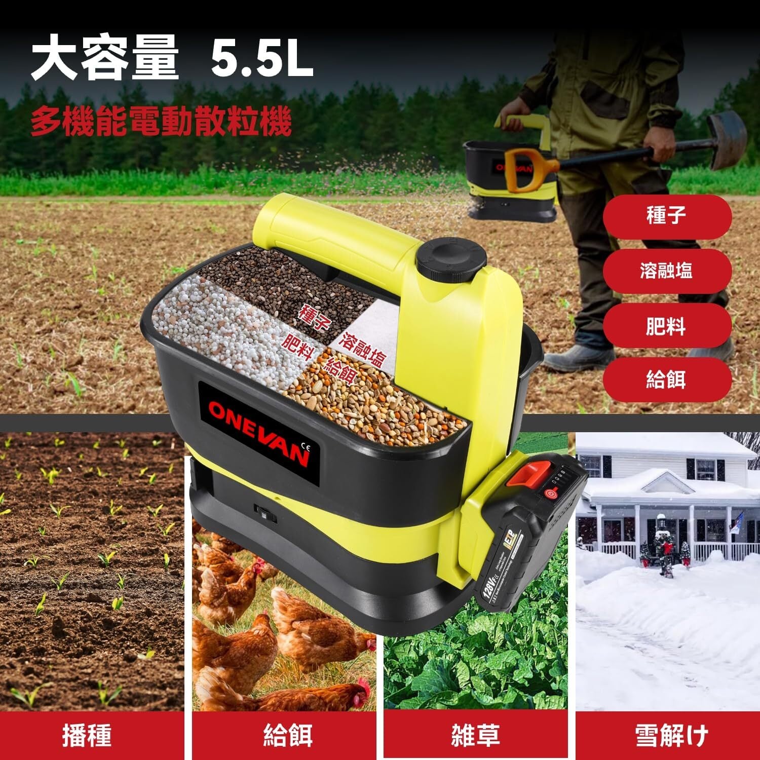ONEVAN 散粒機 電動 肥料散布機 充電式 散布機 コードレス 種まき機 5.5L 播種機 6段階設定 最大拡散角140° 5m散布幅 均一散布 マキタ18vバッテリー対応 持ち運び便利 軽量 粒剤 種子 除草剤 顆粒 種まき 目土 飼料 凍結防止剤拡散 バッテリー付き
