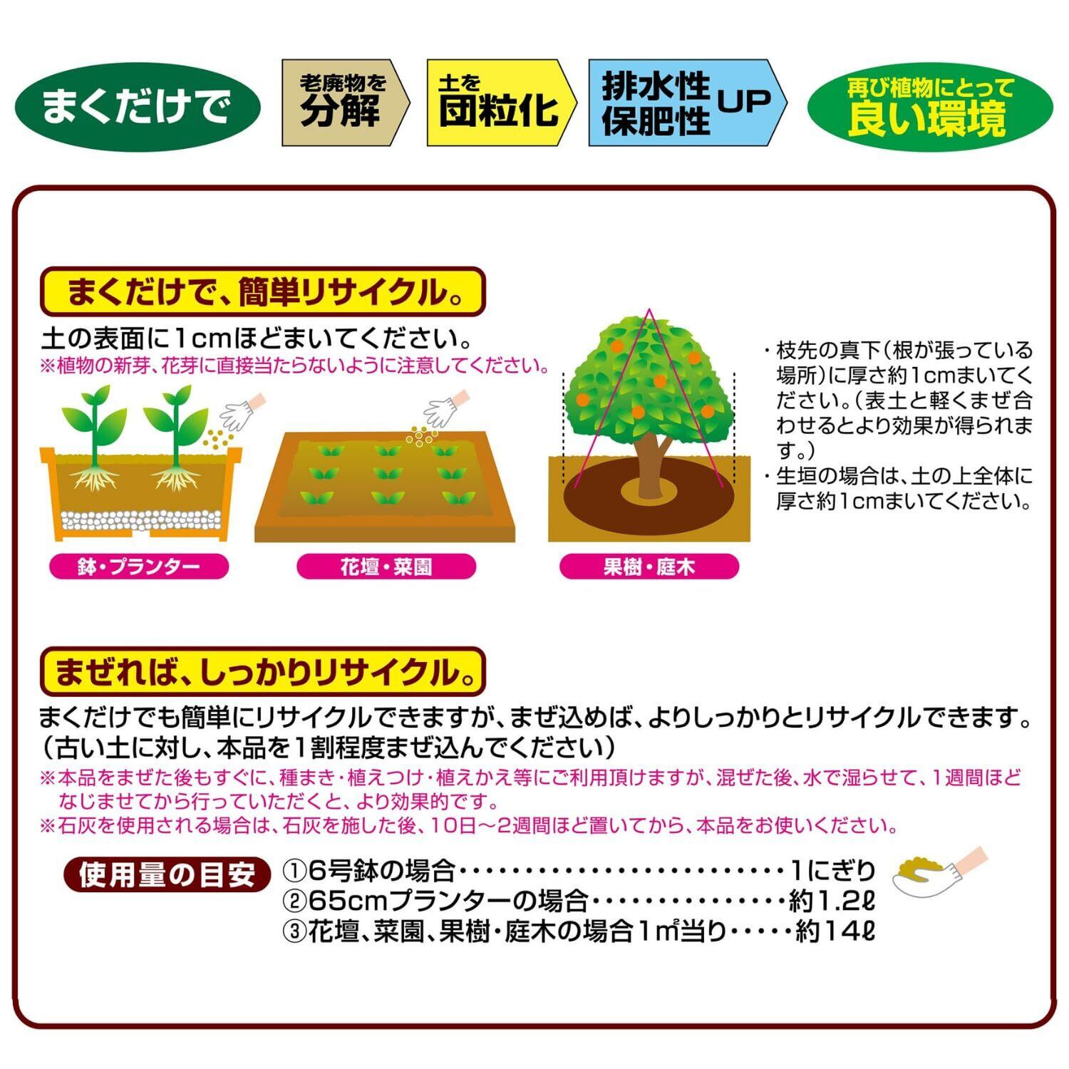有効微生物が、根などから出る老廃物を分解し、一部を栄養分として再び植物に補給します。また土の団粒化を促し、排水性の向上など植物が生育しやすい土にします。