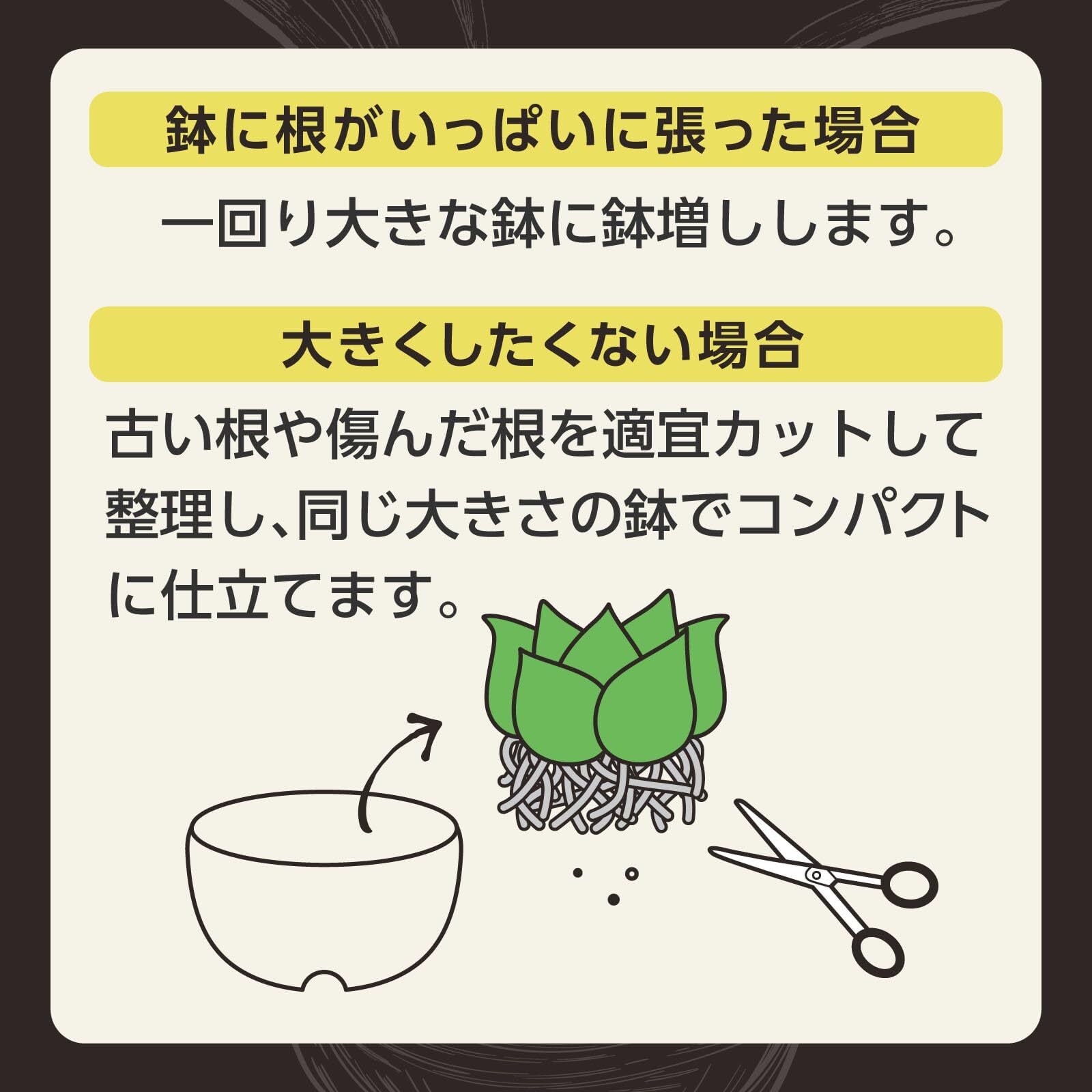 ※植え替えの数日前から水やりを中止して培養土を乾かしておくと作業がしやすいです。