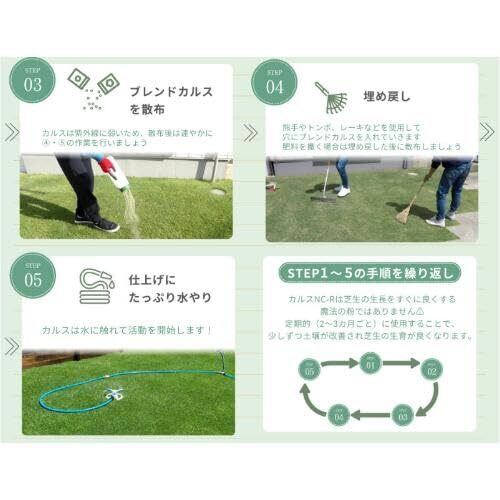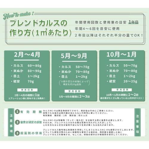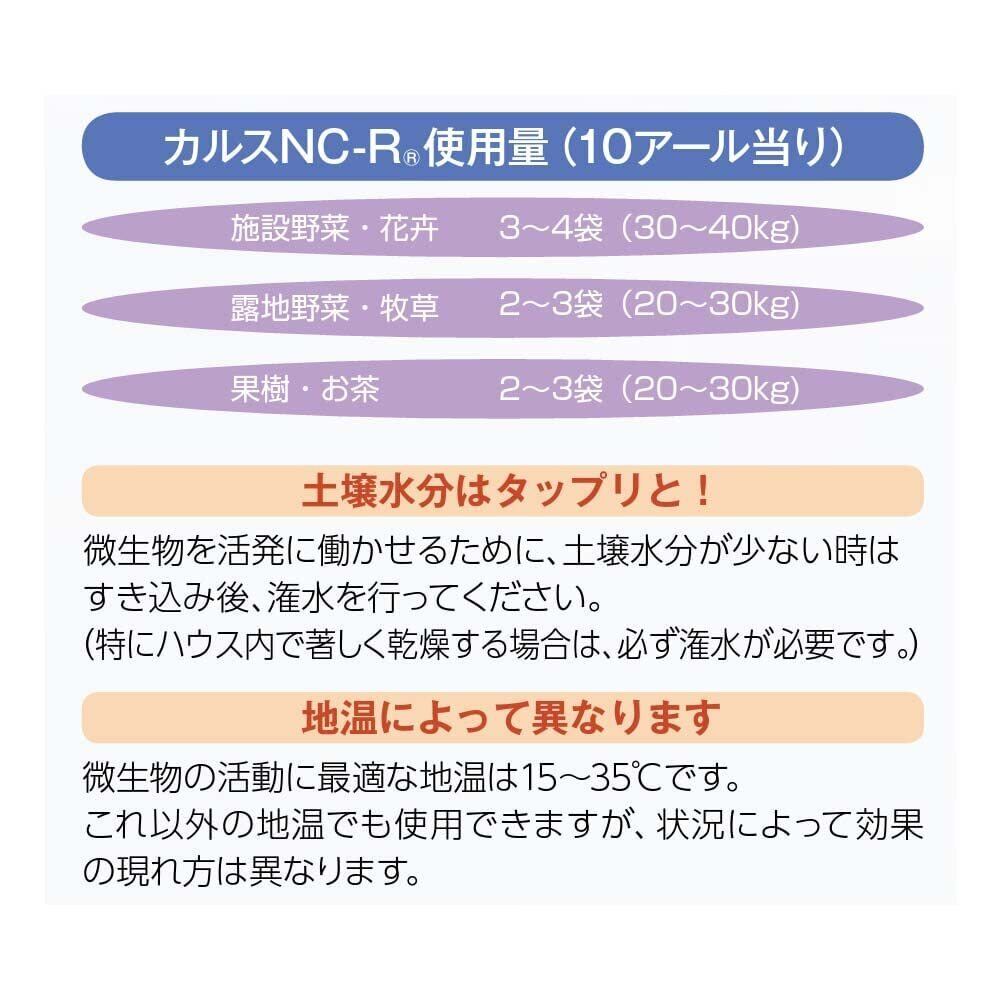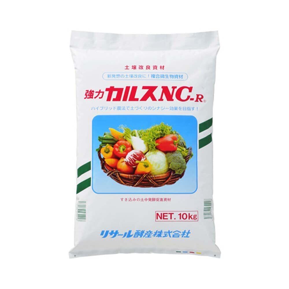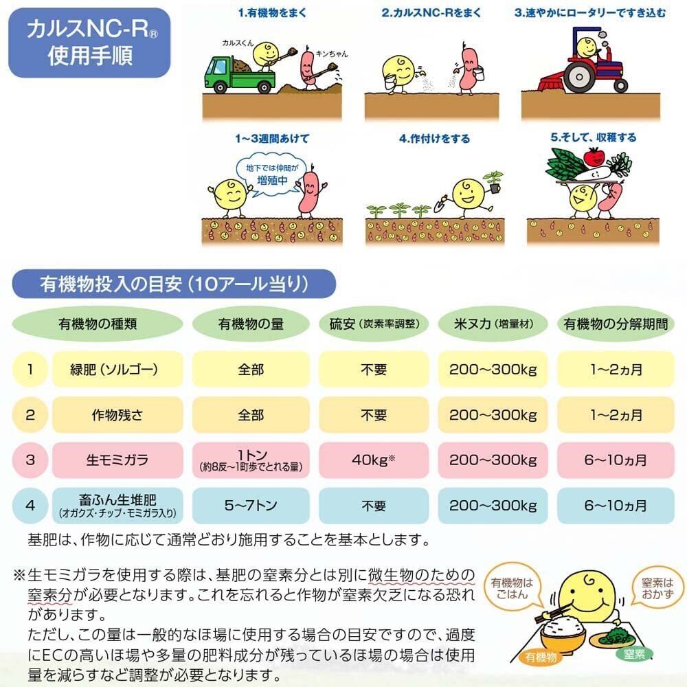 土壌改良剤(土壌改良材) 複合微生物資材「カルスNC-R」は多様な微生物による『土づくり資材』です。 生の有機物と一緒にすき込み、"有害ガス"を発生させず確実に土の中で堆肥化(分解)できます。 資材に含まれている微生物の働きで土が丈夫になり、肥料効果を高め作物の食味・品質・収量の向上につながります。 有機物の種類は問わず、また手間もかけずに安心してリサイクルでき環境にも優しい微生物資材です。 ラクラク 簡単 土づくり 従来の堆肥づくりにおける面倒な切り返しや、作業を省き大幅な省力化を実現します。 ほ場に完熟堆肥を使用するのではなく、生の有機物を一緒にすき込むことで微生物の働きを活発にし、土の中で堆肥化します。 使用量(10aあたり) 施設野菜・花卉 3~4袋(30~40kg) 露地野菜・牧草 2~3袋(20~30kg) 果樹・お茶 2~3袋(20~30kg) 切り返しのいらない土中ボカシ 米ヌカなどの有機物を直接ほ場にすき込み微生物の力で基肥(ボカシ肥)とすることもできます。この場合、ボカシ材料の総重量に対して5%以上のカルスNC-Rを添加し、すべてをすき込みます。すき込み後、10日以上経てば作付けが可能となります。 使用方法 施設野菜・花卉 3~4袋(30~40kg) 露地野菜・牧草 2~3袋(20~30kg) 果樹・お茶 2~3袋(20~30kg)
