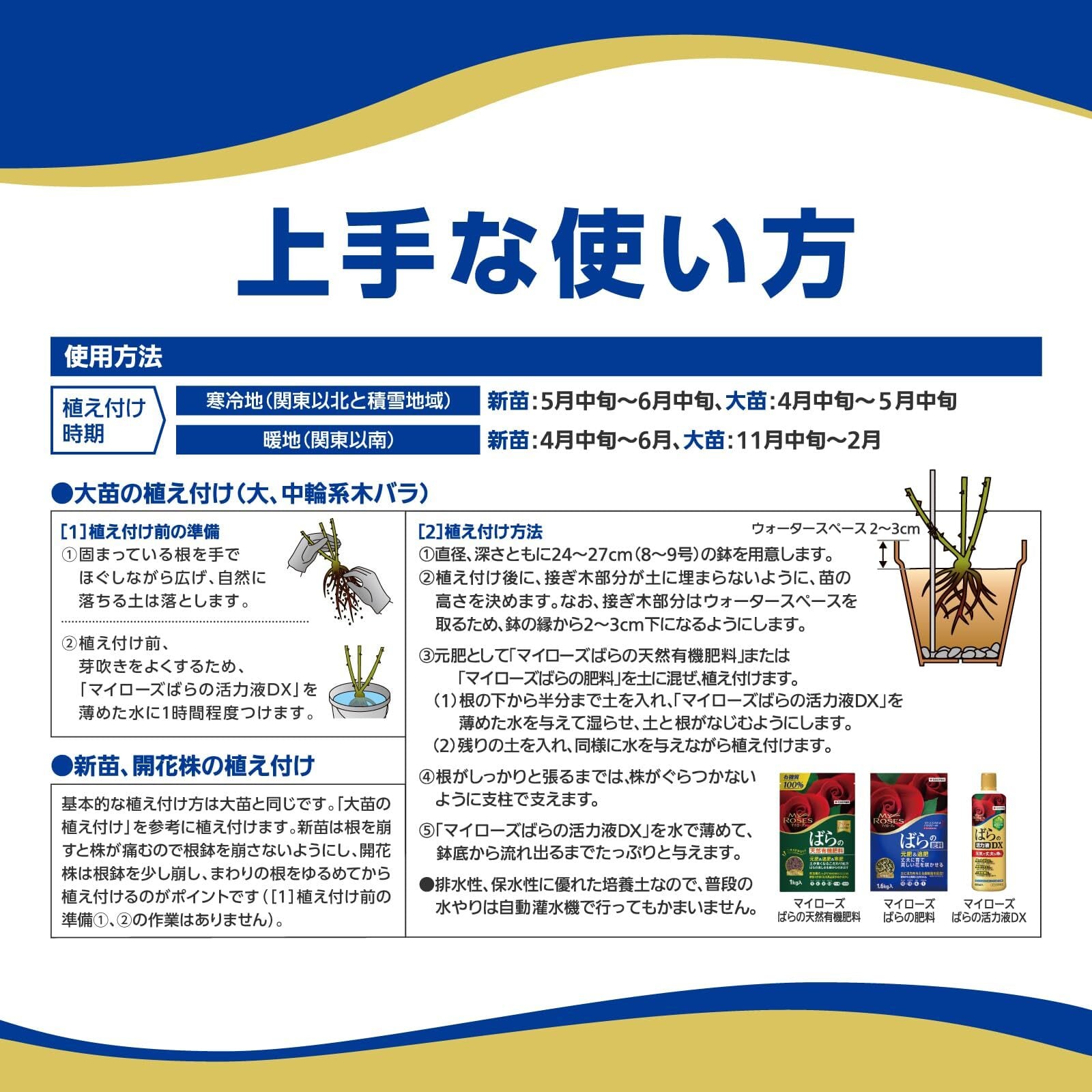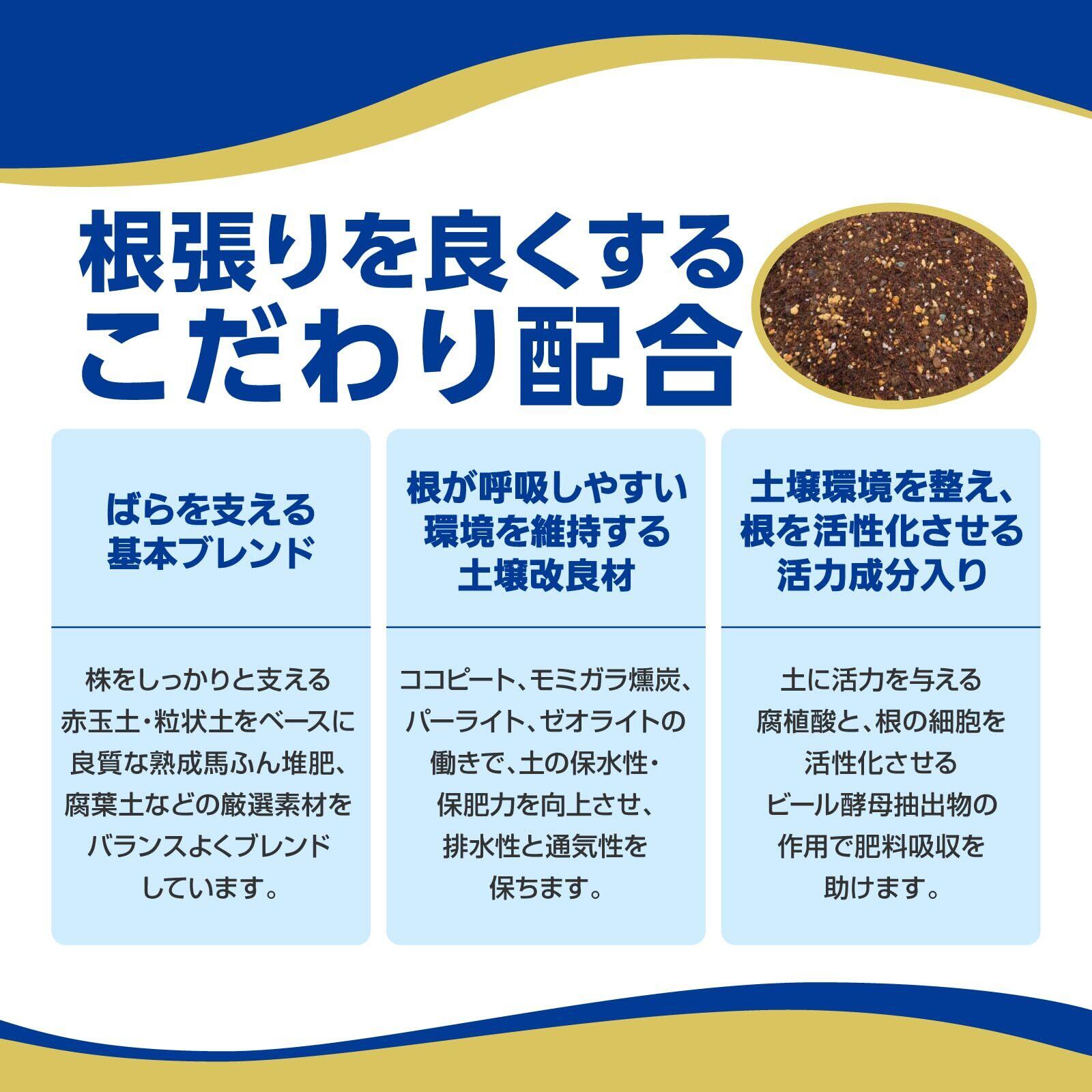 ●基本培養土に各種土壌改良資材を贅沢にブレンドした「根を育てばらが元気にきれいに咲くプレミアムな培養土」です。