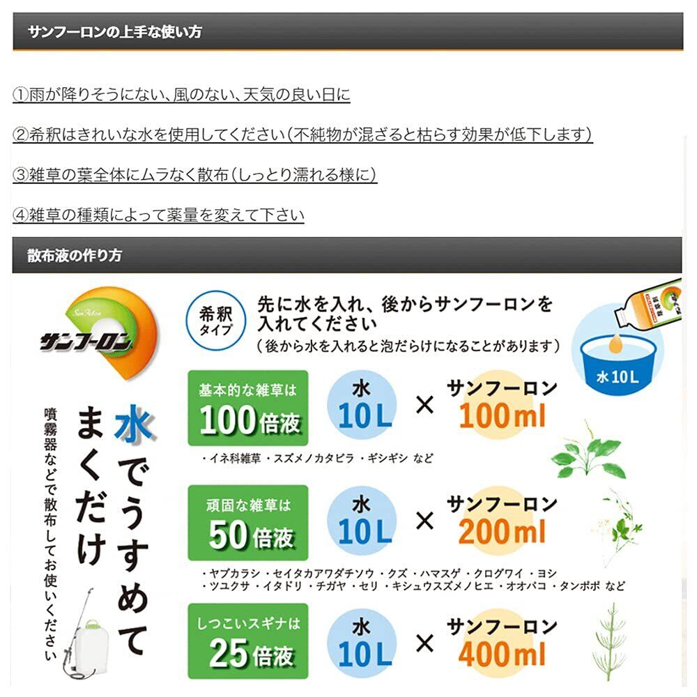 使用方法:水50~100Lに薬液250~1000mlで散布面積約10a