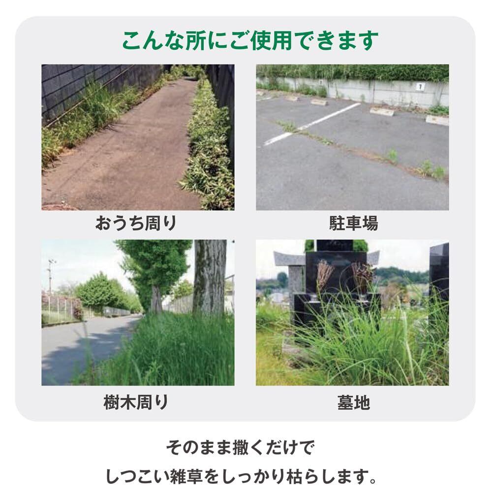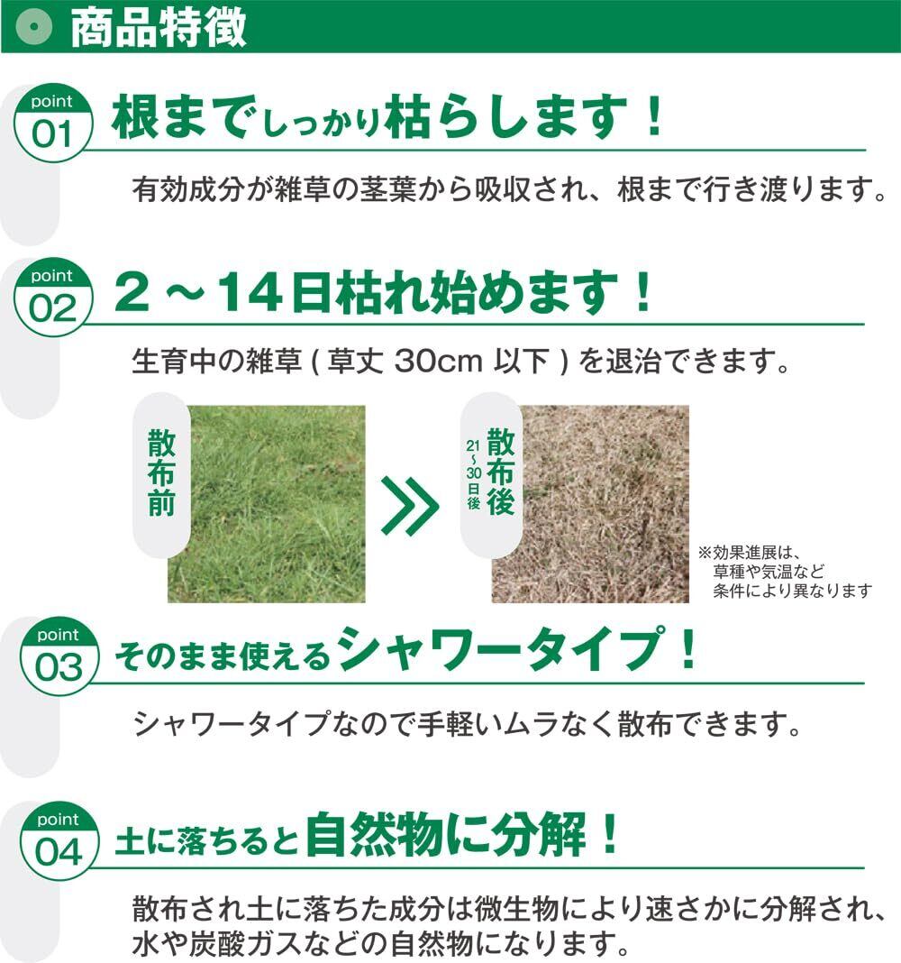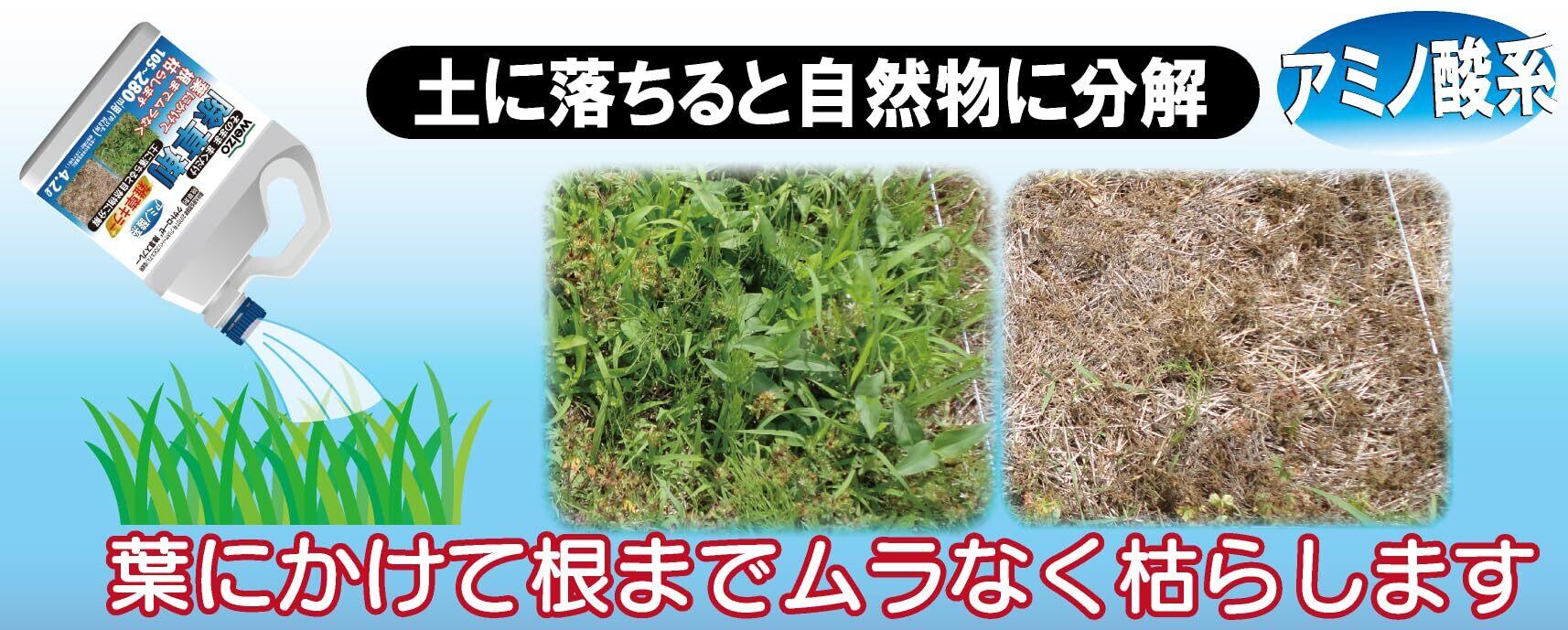 有効成分が雑草の茎葉から吸収され、根まで行き渡り枯れムラが少ない除草剤です。