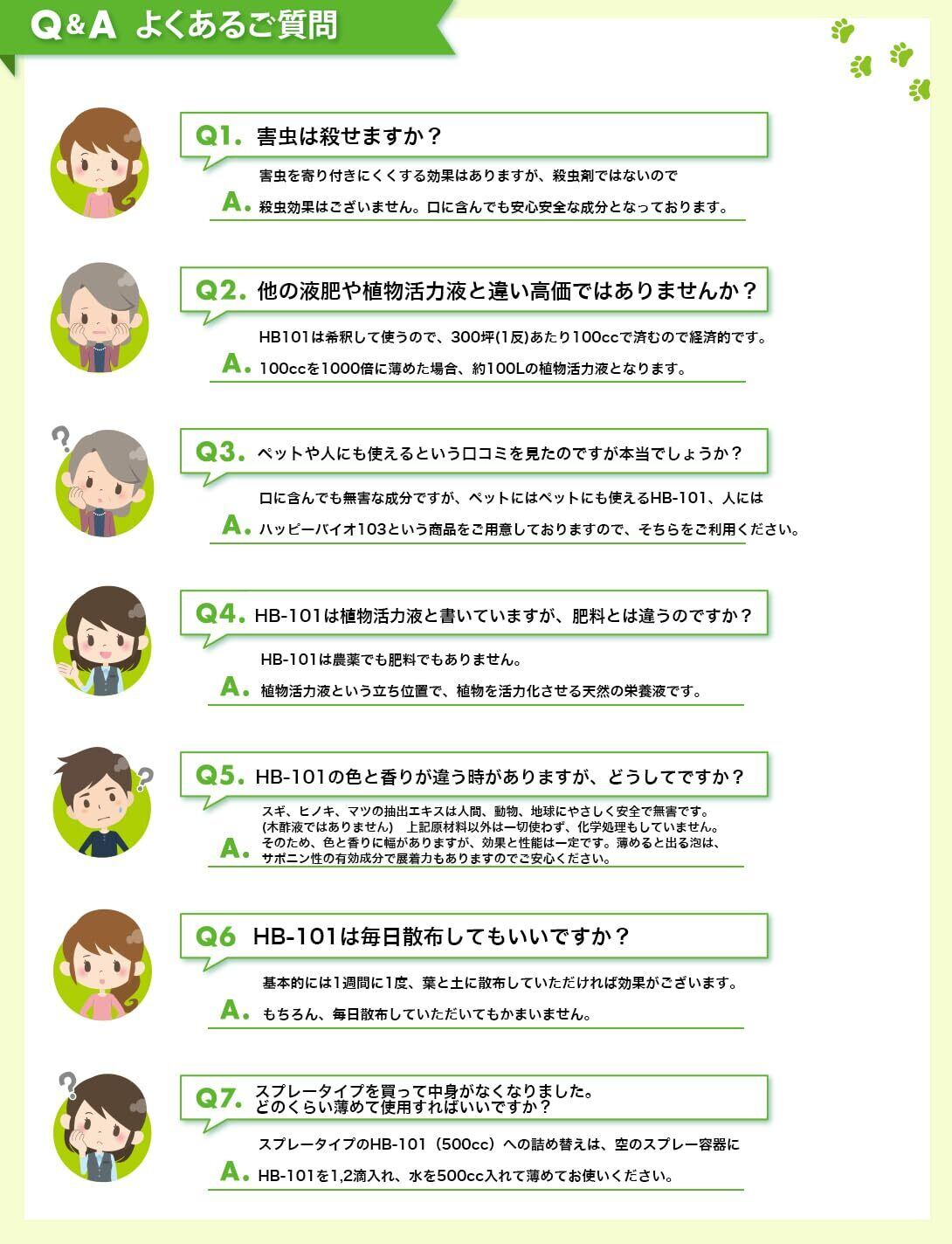 HB-101の原液を30坪当たり10cc 1000倍~10万倍に薄めて春・夏・秋は月に3~4回 冬は月に1~2回散布して下さい。