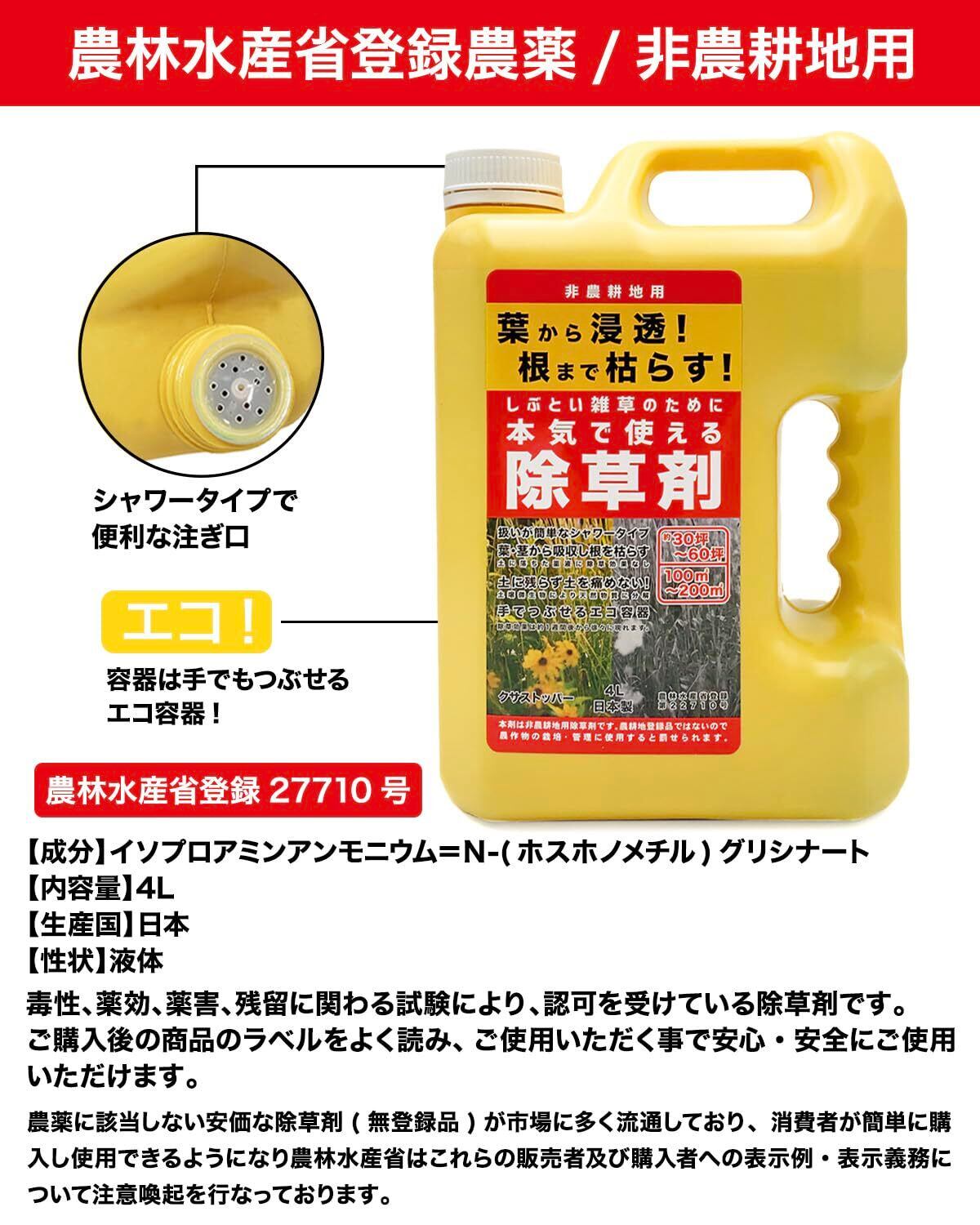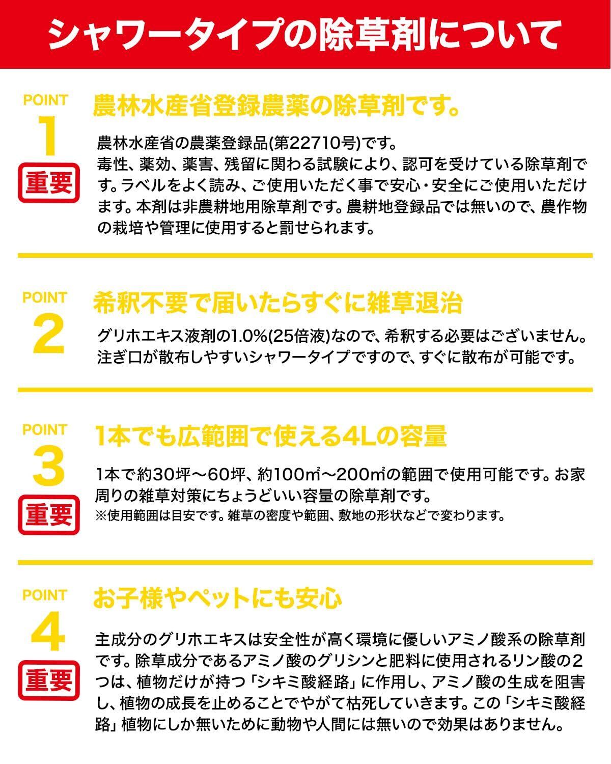 【散布しやすい注ぎ口シャワータイプ】扱いが簡単な注ぎ口がシャワータイプになっているので、広い場所にすばやく散布できます。詰め替えたり別途散布器を用意する必要がありません!4Lで約100~200平方m散布できます。(約30~60坪)