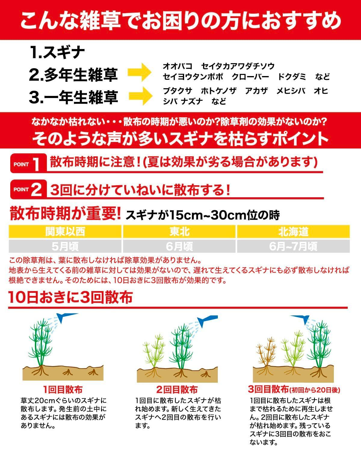 【適用雑草名】・スギナ ・多年生雑草(オオバコ、セイヨウタンポポ、セイタカアワダチソウ、クローバー、ドクダミなど) ・一年生雑草(メヒシバ、オヒシバ、スズメノカタビラ、スズメノテッポウ、エノコログサ(ネコジャラシ)、カラスムギなど)