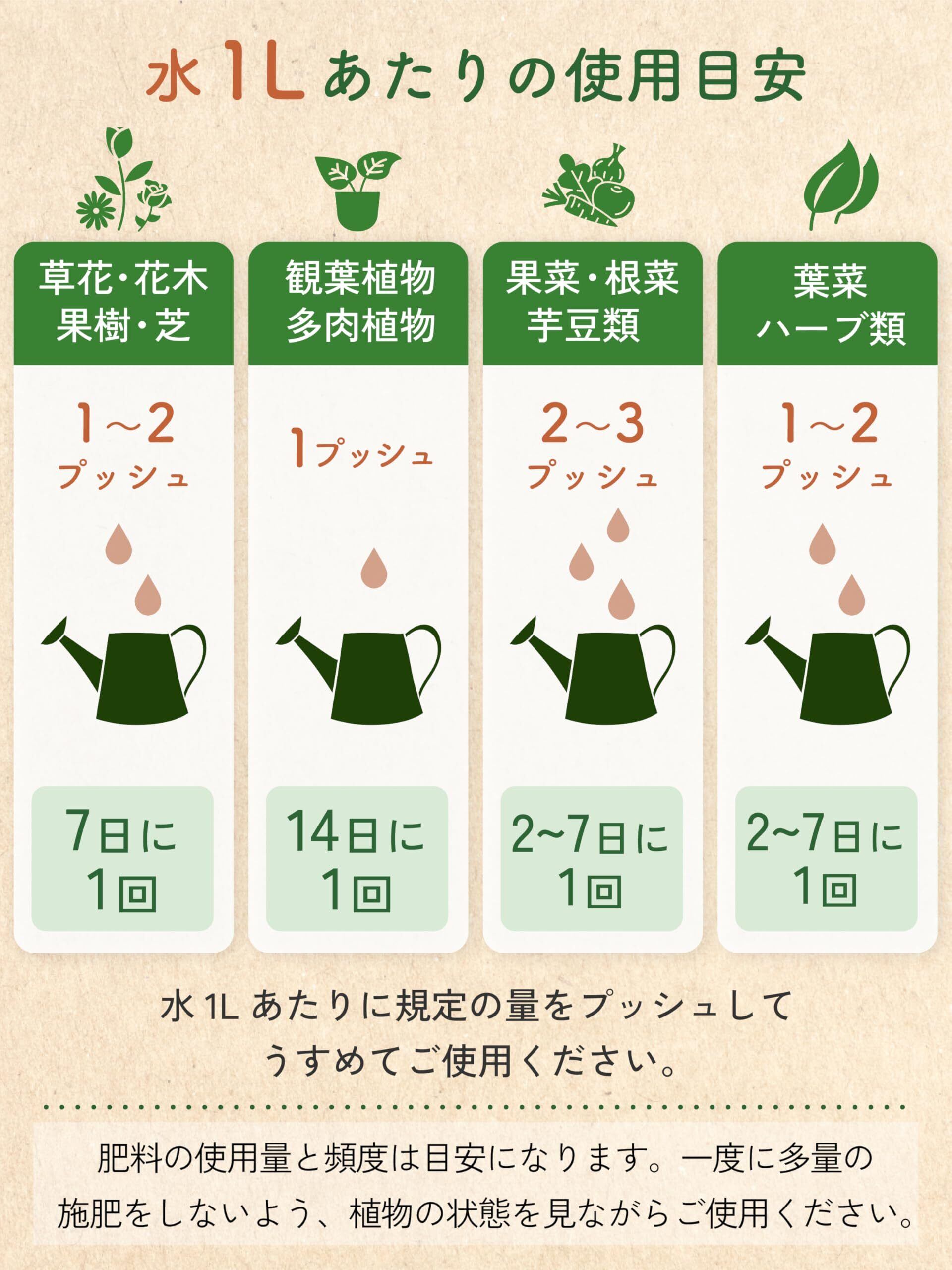 ワンプッシュで簡単に計量ができる、水でうすめる有機原料入りの液肥