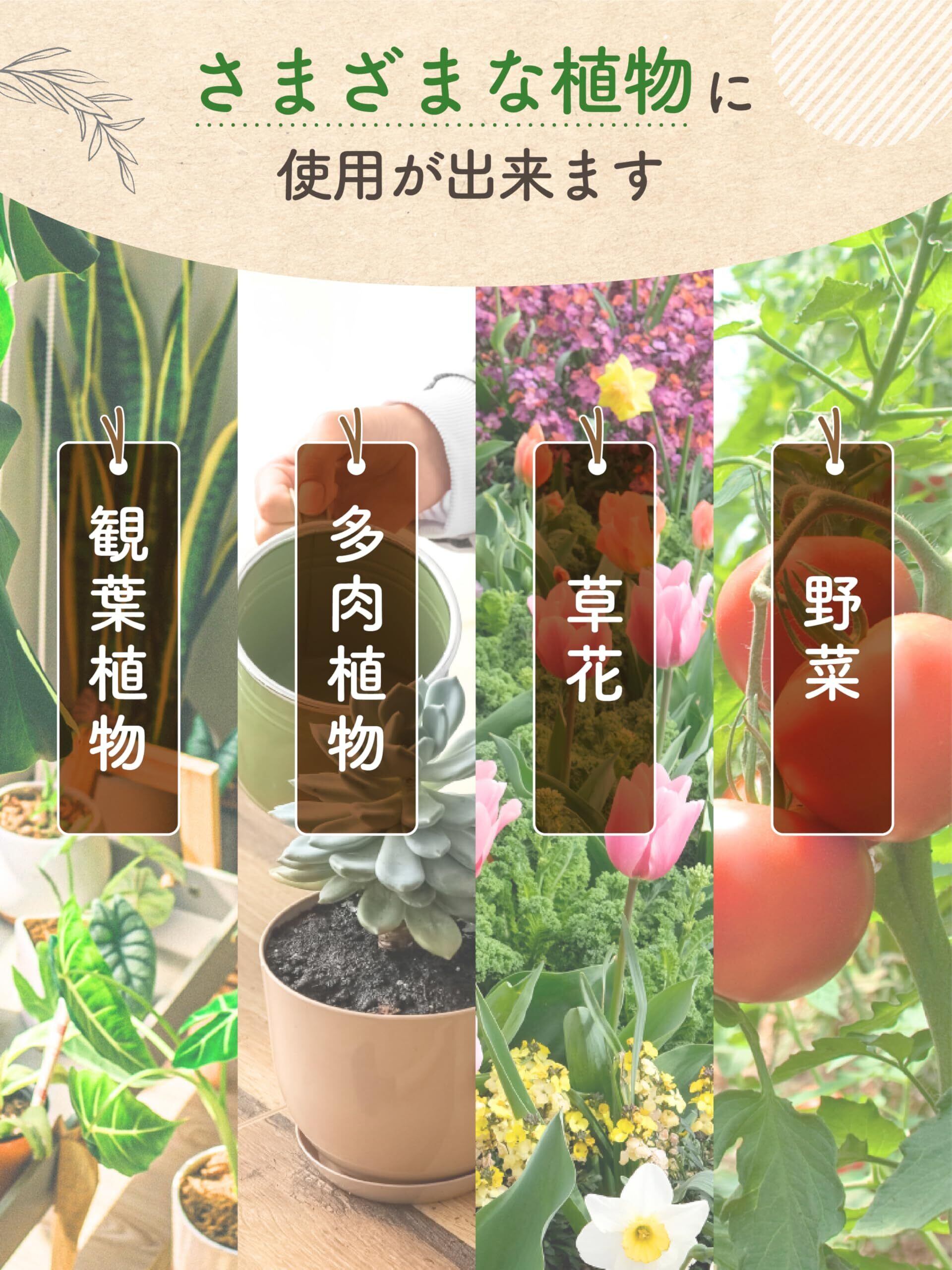 草花、花木、果樹、芝、観葉植物、多肉植物、果菜、根菜、芋豆類、葉菜、ハーブ類など、様々な植物に幅広く使用可能