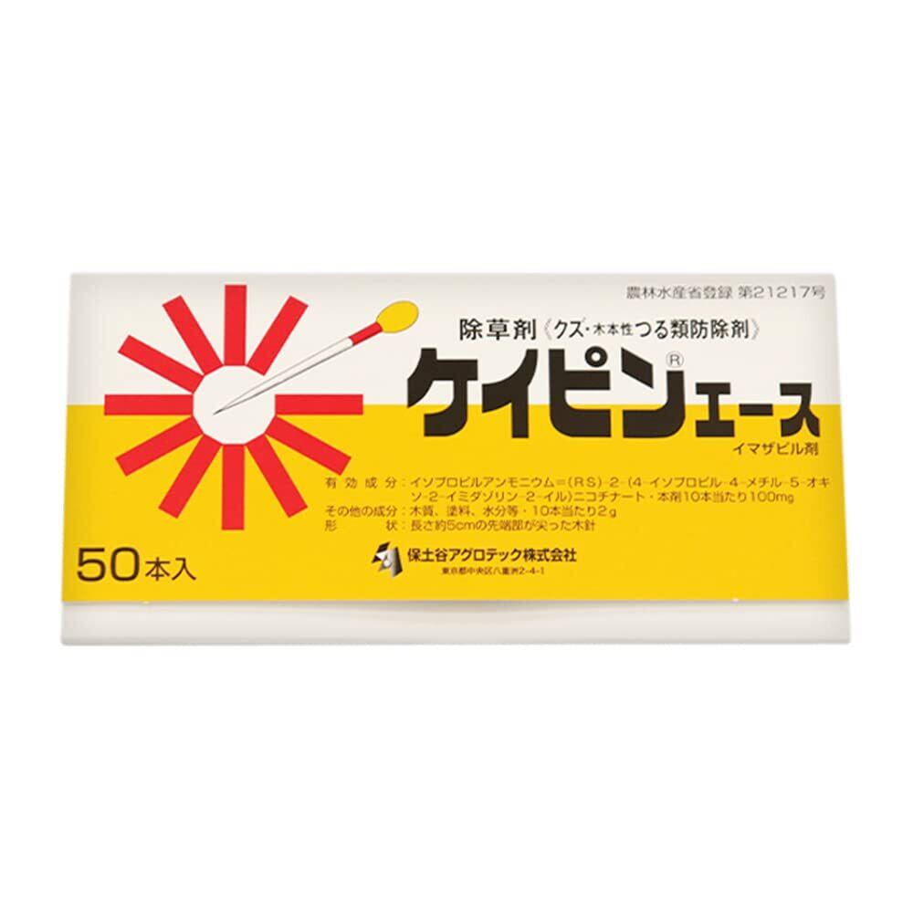 難防除とされる「クズ」枯殺の専用剤 【用途】 クズの除草剤 【特徴】 ・特殊製剤(木針製)であり、持ち運びに便利で能率的に作業することができる ・ごく微量の有効成分をクズの根株に施用することにより、クズの全体を防除することができる ・一年中使用でき効果の差はないが、根株の見つけやすい秋~春(冬期)に処理するのが効率的 ・「ケイピンエース」は、通常の除草剤とは全く異なったユニークな「除草材」で、強力な殺草力をもつイマザピルを木針(楊枝状)に浸み込ませ、特殊な製剤に加工しており、難防除とされる「クズ」枯殺の専用剤 【注意事項】 ※本剤は非農耕地および造林地(すぎ、ひのき)の下刈り代用として使用してください。 ※本剤は根株にさすのが最も効果的です。 ※つる(茎)にさす場合は、直径が1cm以上のものにさし込んでください。 ※ただし、下刈り代用の場合は直径3cm以上の株のみ処理し、つるへの処理は行わないでください。 ※茎葉散布剤処理後、残った大株に処理するようにしてください。 ※処理後、本剤が抜けて落ちると造林木に薬害を生じるおそれがあるので、簡単に抜けないよう適当な太さの錐などで穴をあけてさし込んでください。 ※使用時期は通年となっていますが、根株の見つけやすい秋~春が効率的です。 ※薬剤が雨、雪などで流れ落ちると造林木に薬害発生のおそれがあるので、薬の露出部が全部かくれるようさし込んでください。 ※降雨、降雪中での使用はさけてください。 ※使用にあたっては、使用量、使用方法、使用条件(土壌条件など)を誤らないように注意し、特に初めて使用する場合は林業関係機関等の指導を受けるようにしてください。 ※本剤処理の前後に処理株のつる切りを行うと、切り口の溢泌水によって植栽木に薬害を生じることがあるので注意してください。 ※使用の際は不浸透性手袋などを着用してください。 ※かぶれやすい体質の人は取扱いに十分注意してください。 ※公園、堤とう等で使用する場合は、処理中および処理後(少なくとも処理当日)に小児や処理に関係のない者が処理区域に立ち入らないよう、縄囲いや立て札を立てるなど配慮し、人畜等に被害を及ぼさないよう、注意を払ってください。 ※使用残りの薬剤は、必ず安全な場所に保管してください。 ※木質部は可燃性なので火気に近づけないでください。