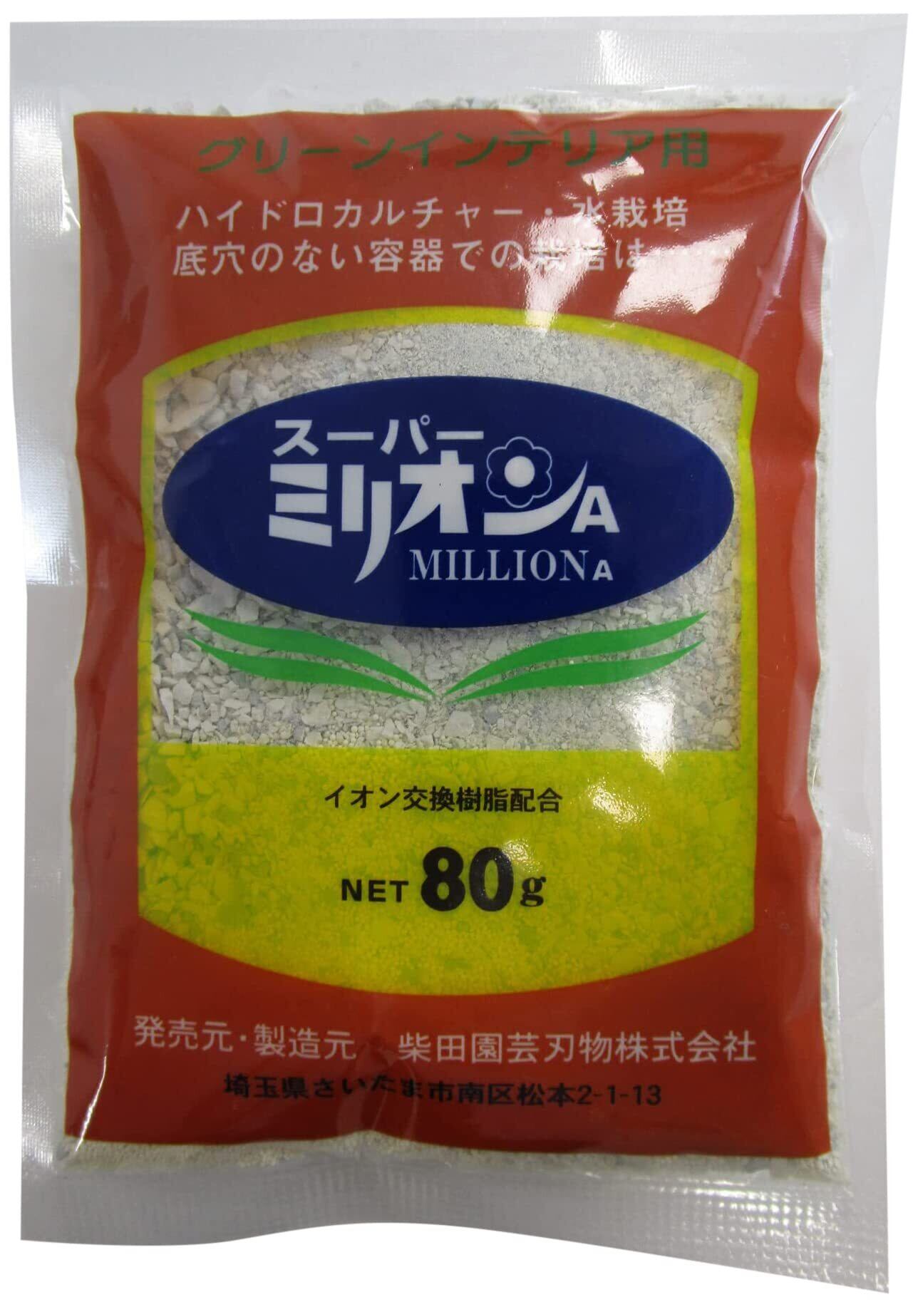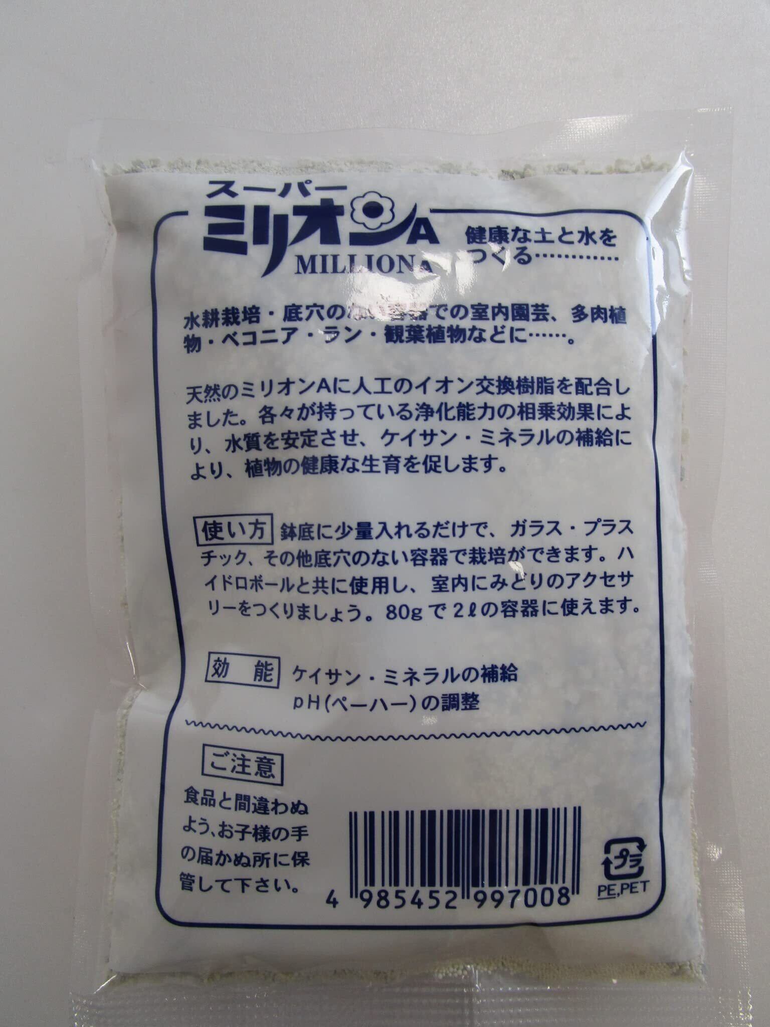 ハイドロボール等、水耕栽培に使用する根腐れ防止剤です。 珪酸白土にイオン樹脂を配合しているので、水の浄化作用に優れています。 天然のミリオンAに人工のイオン樹脂を 配合しました 各々が持っている浄化能力の相乗効果により、 水質を安定させケイサン・ミネラルの 補給により、植物の健康な生育を促します 【使い方】 鉢底に少量いれるだけで、ガラス、 プラスチック、その他鉢穴のない容器に 栽培ですます ハイドロボールと共に使用し、 室内にみどりのアクセサリーを作りましょう 80gで2Lの容器に使えます 【効能】 ケイサン・ミネラルの補給 PHの調整