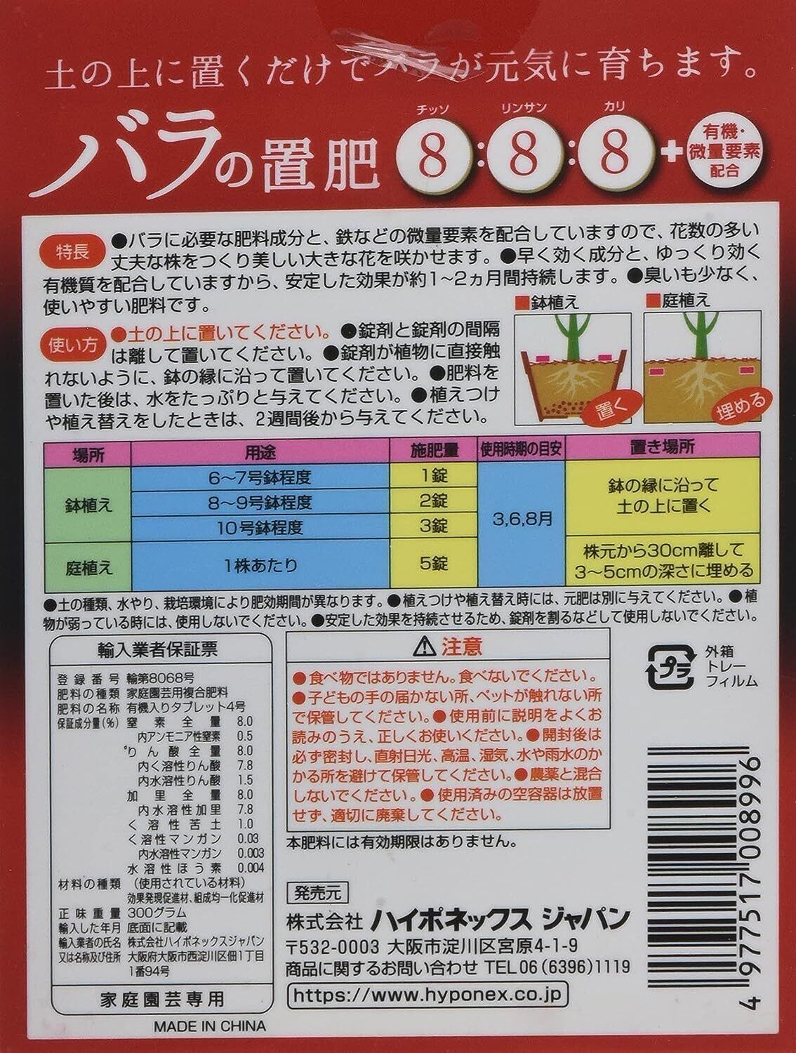 バラに必要な肥料成分と微量要素を配合。花数の多い丈夫な株をつくり、美しい大きな花を咲かせます。