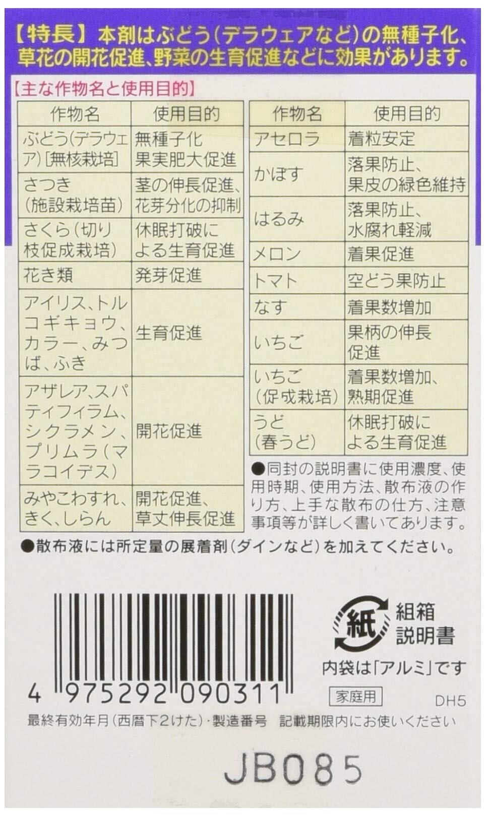 ・ぶどうの無種子化や果粒肥大促進、草花の開花促進、草丈伸長促進、野菜の生育促進などの効果がある