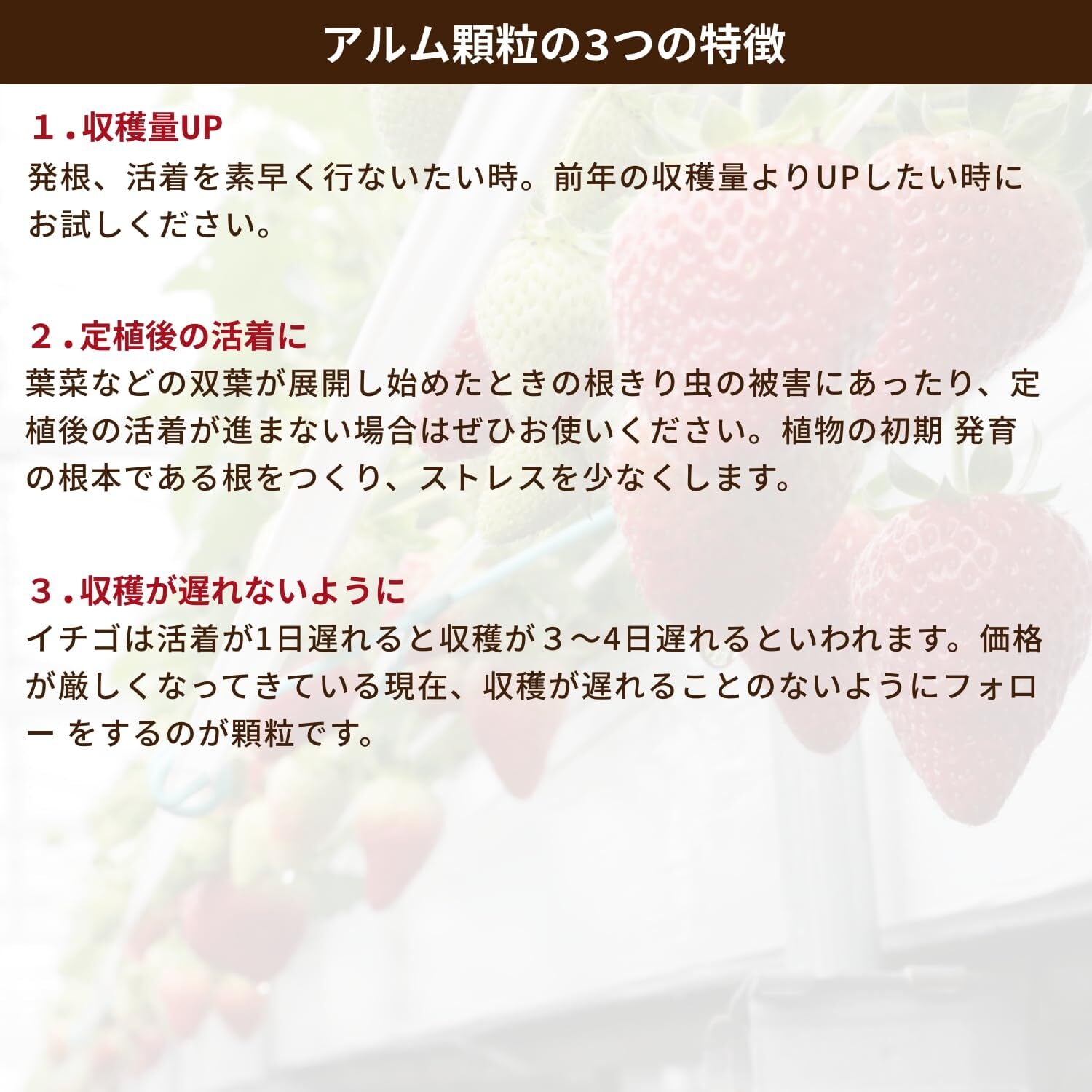 4.イチゴは活着が1日遅れると収穫が3~4日遅れるといわれます。価格が厳しくなってきている現在、収穫が遅れることのないようにフォロー をするのが顆粒です。