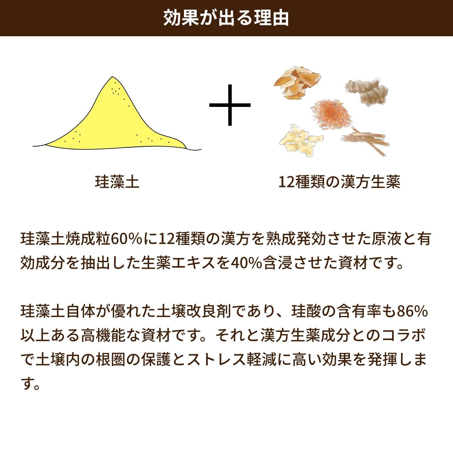 珪藻土焼成粒60%に12種類の漢方を熟成発酵させた原液と有効成分を抽出した生薬エキスを40%含浸させた資材