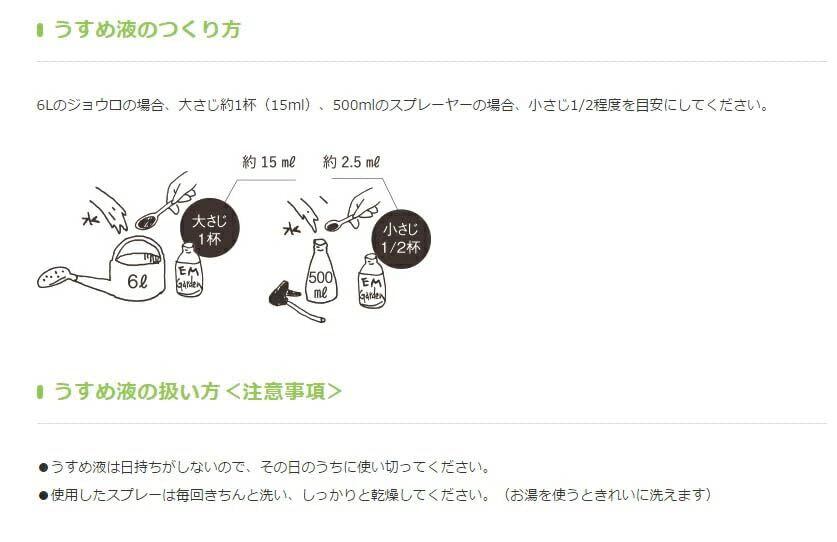 水で500倍程度に薄めて使います。朝の水やりの際に、土および植物全体がしっとりと濡れるようにうすめ液をかけてください。