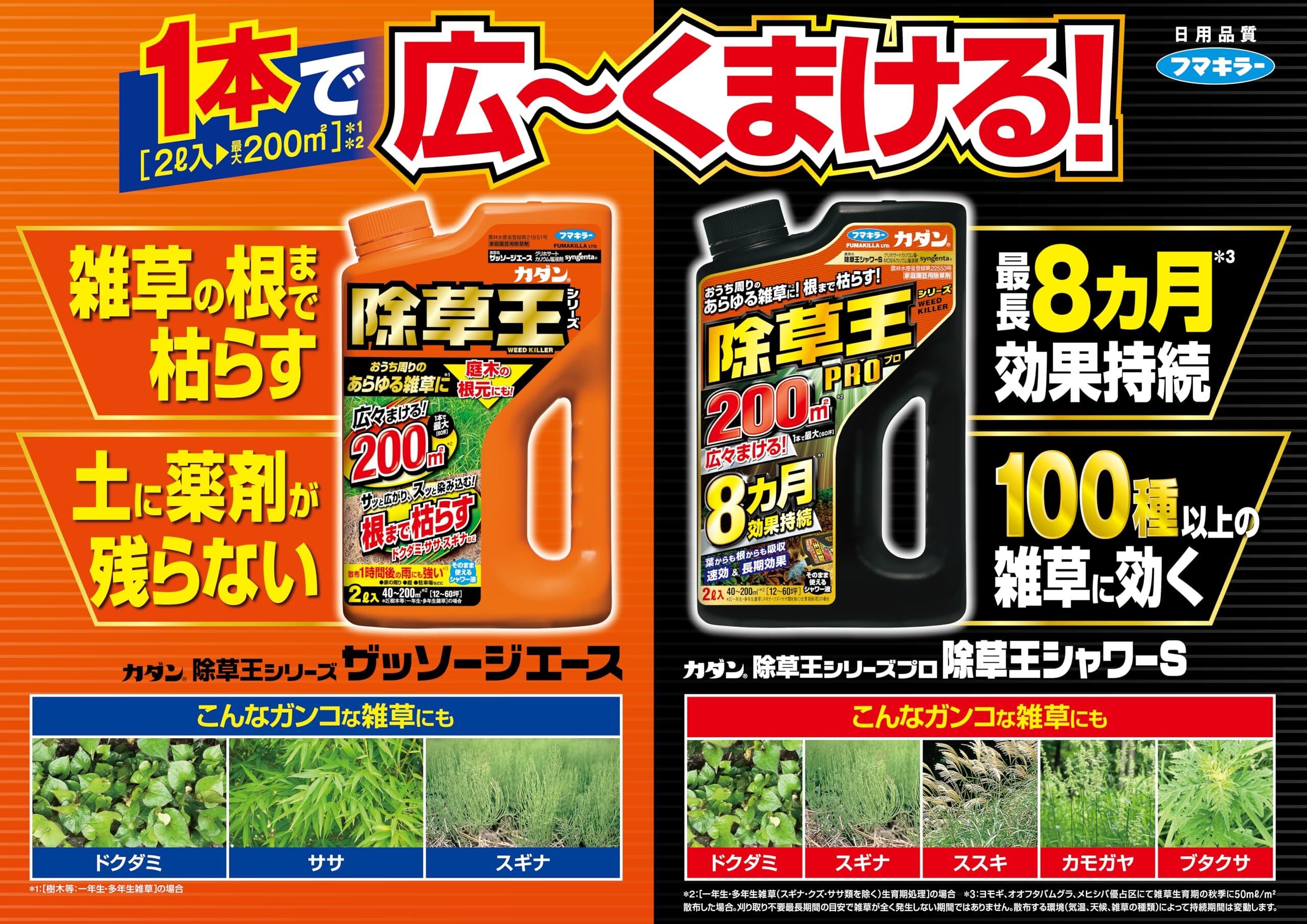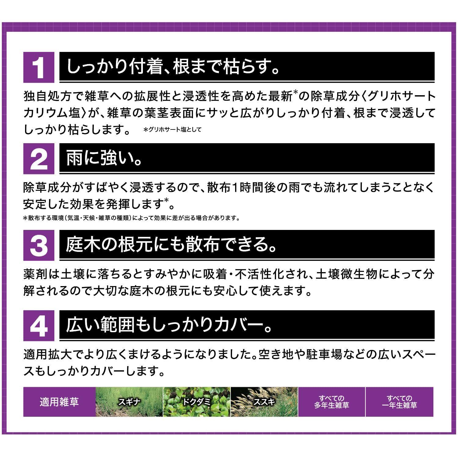 庭木の根元にもつける速効タイプの除草剤 【特徴】 ・広い範囲もしっかりカバー ・独自処方でしっかり付着、根まで枯らします ・除草成分がすばやく浸透するので、雨に強く安定した効果を発揮 ・庭木の根元に散布できます 【注意事項】 使用に際しては必ずをよく読んで、記載内容に従ってご使用ください