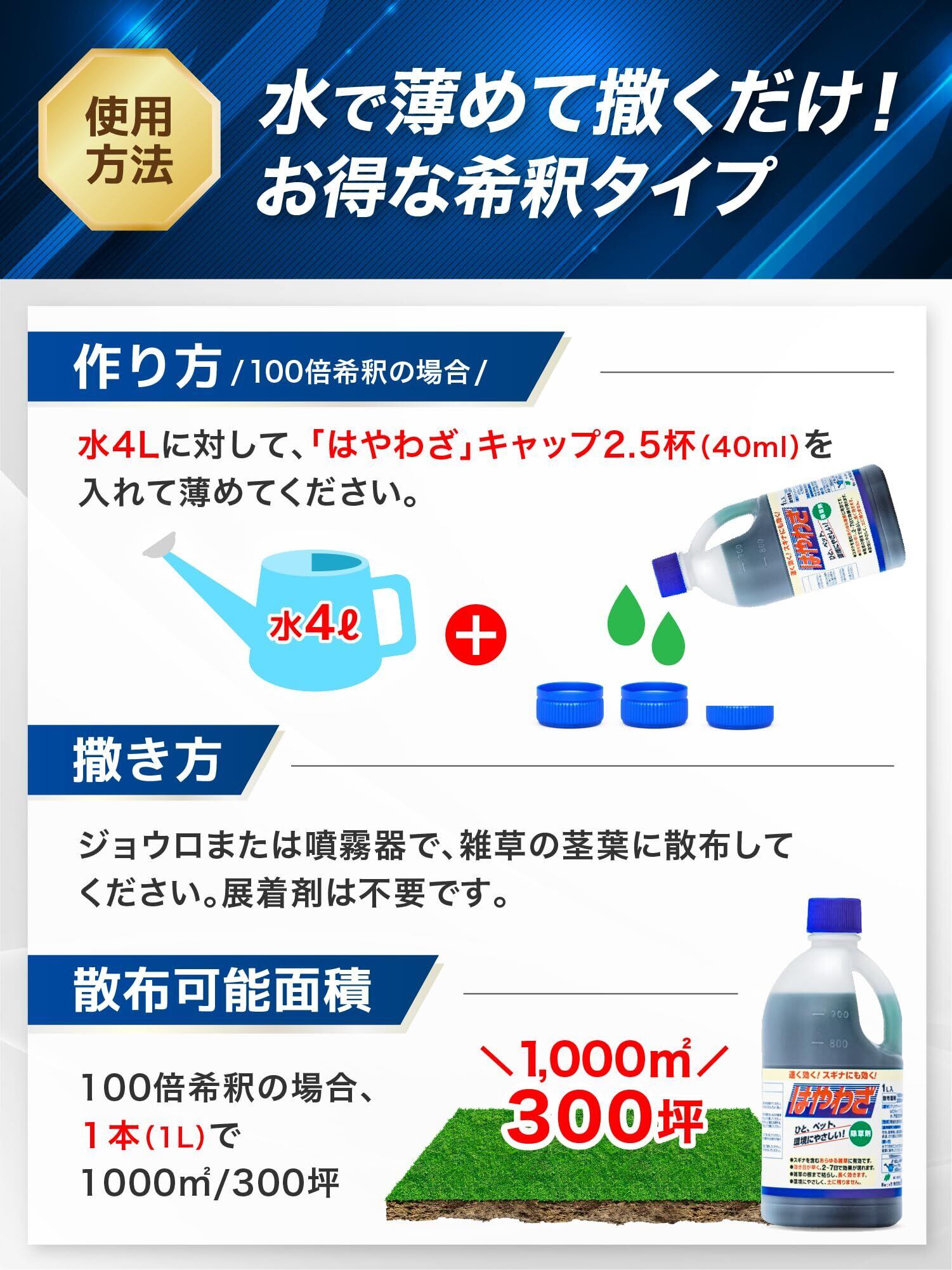 【注意事項】除草効果を発揮させたくない、周囲の植物への飛散しないよう注意してください。散布後、雨が降った際、再散布が必要な場合があります。散布後効果が発揮されるまで草刈りは避けてください。