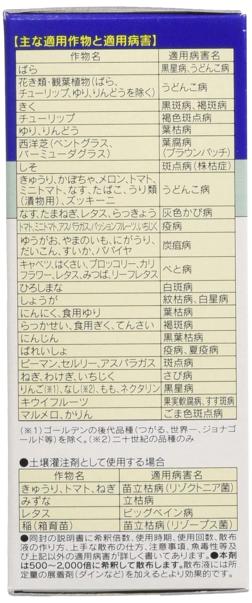 特徴:草花、野菜、果樹など様々な植物で、かび類(糸状菌)によって起こり、葉が変色するタイプの広範囲の病気に効果がある優れた総合殺菌剤です。