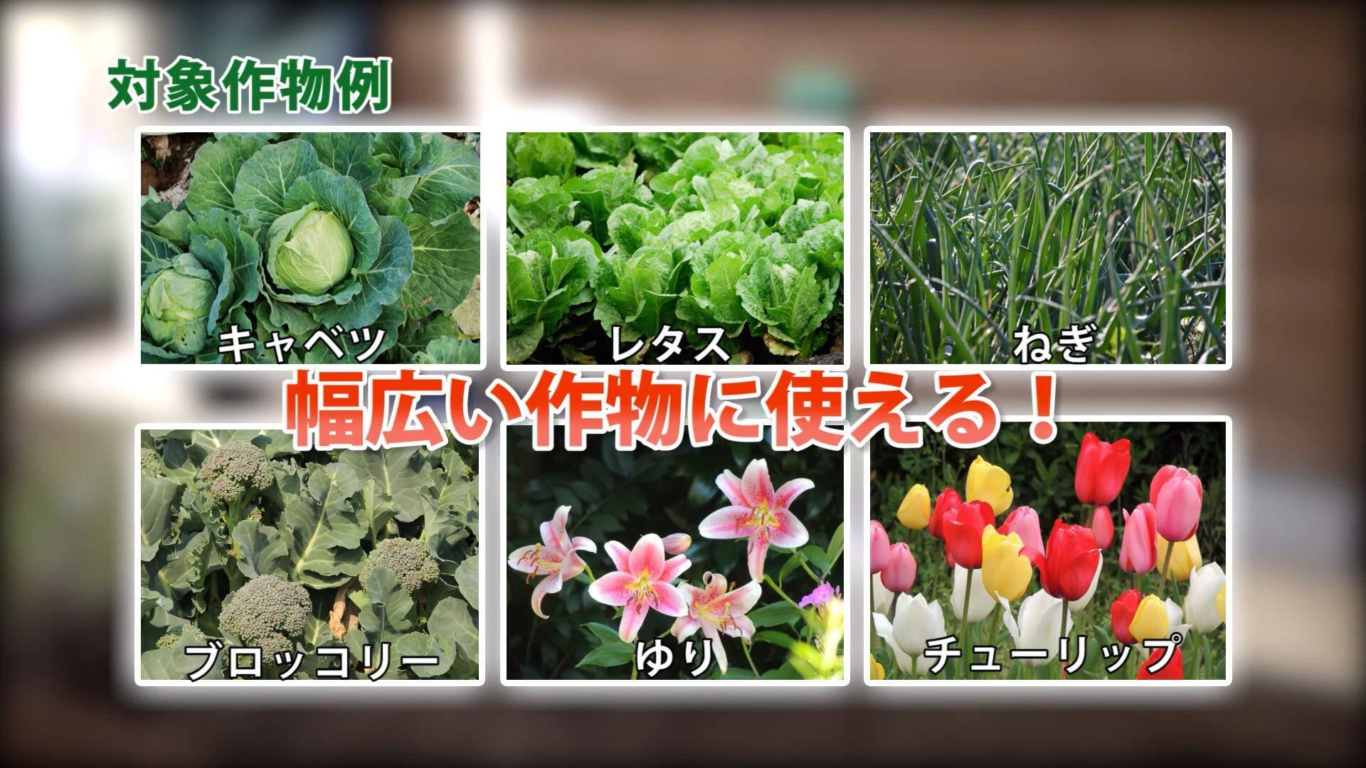 特徴:土に混ぜたり、株元に散布する(ねぎ、にら、らっかせい)だけで、土の殺菌・消毒ができる土壌殺菌剤です。