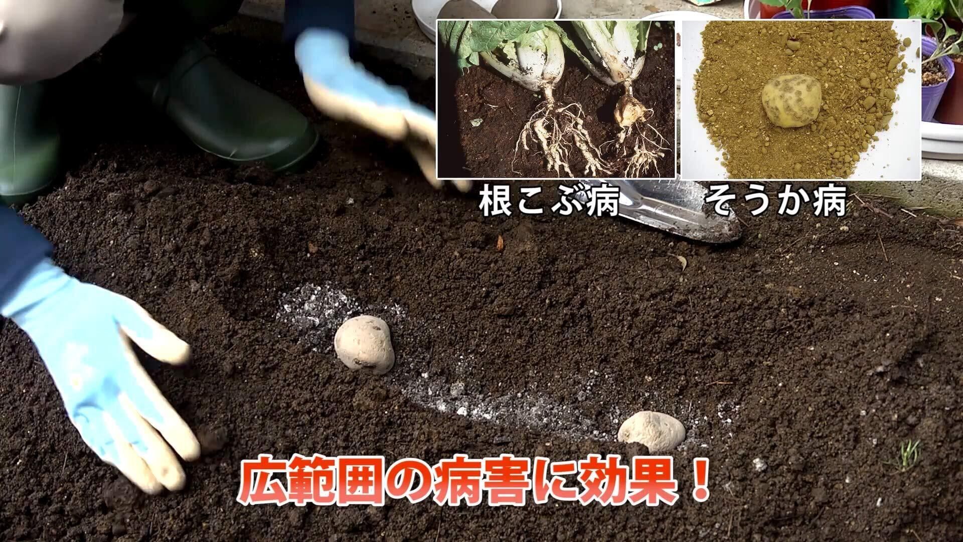 ・ぶらな科野菜の根にコブができる根こぶ病をはじめ、キャベツの苗立枯病や菌核病、ねぎの白絹病、ばれいしょのそうか病など広範囲の病害にすぐれた予防効果がある