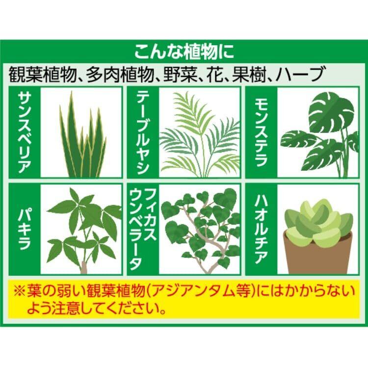 1.使用方法 使用前によく振ってそのまま散布してください。 ●成虫を退治!:葉や土の表面にいるクロバネキノコバエに直接散布。※飛んでいる虫には効果はありません。 ●成虫を寄せつけない!:忌避したい植木鉢内の土全面に3~4日に一回を目安に散布(土表面が濡れる程度)。 ●幼虫を退治!:植木鉢内の土全面に3~4日に一回を目安に散布(土表面が濡れる程度)。 2-1.使用上の注意 ●本剤を初めて使用する場合は、使用者の責任において事前に植物への薬害の有無を充分確認してから使用する。 ●花弁にかからないように注意する。 ●弱った植物や病害虫が多発した植物・傷ついた植物には薬害が生じる場合があります。 ●日中高温時、強風時、降雨前の使用はさける。 ●降雨後、水やり後は再度散布する。 ●飲用、食用ではありません。植物の害虫対策に使用してください。 ●人に向かって噴射しない。 ●自動車、ブリキ、銅、真鍮、家具、床、カーテン等に噴霧液が付着したら直ちに水洗いし、水気をふき取る。 ●皮膚に付かないように注意し、付いた場合は直ちに石けんで充分洗う。 ●眼に入らないように注意し、入った場合は直ちに充分水洗いし、眼科医の手当てを受ける。 ●有効年月内に使用する。 2-2.保管上の注意 ●直射日光をさけ、凍結のおそれのない涼しく乾燥した場所に保管する。 ●小児の手の届かない所に保管する。 2-3.廃棄上の注意 ●使用後は地域の分別区分に従って廃棄する。