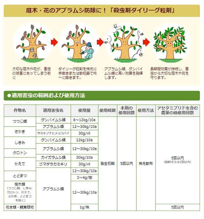 【特徴】 処理が簡単。株元に散布するだけ。 アブラムシ類、グンバイムシ類に高い効果。 長期効果が持続。 ミツバチに影響が少ない。 臭いが少ない。 【効果薬害等の注意】 1.本剤の使用に当たっては、使用量、使用時期、使用方法を誤らないように注意し、特に初めて使用する場合は、病害虫防除所等関係機関の指導を受けるようにしてください。 2.蚕に対して影響があるので、周辺の桑葉にかからないようにしてください。 3.花き類・観葉植物に使用する場合、幼苗期の使用では薬害を生じる恐れがあるので使用しないでください。 4.適用作物群に属する作物又はその新品種に本剤をはじめて使用する場合は、使用者の責任において事前に薬害の有無を十分確認してから使用してください。なお、病害虫防除所等関係機関の指導を受けるようにしてください。 【使用上の注意】 1.本剤の中毒に対しては、動物実験でL-メチオニン製剤、グリチルリチン製剤及びグルタチオン製剤の注射投与が有効であるとする報告もあります。 2.散布の際は農業用マスクなどを着用してください。作業後はうがいをしてください。 3.街路、公園等で使用する場合は、散布中及び散布後(少なくとも散布当日)に小児や散布に関係のない者が散布区域に立ち入らないよう縄囲いや立て札を立てるなど配慮し、人畜等に被害を及ぼさないよう注意を払ってください。 【保管】 直射日光を避け、なるべく低温で乾燥した場所に密封して保存してください。
