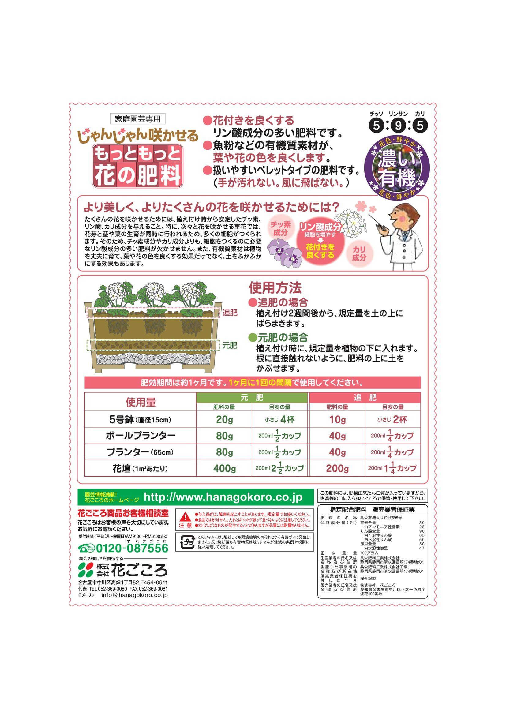 特長:花付きを良くするリン酸成分の多い肥料。魚粉などの有機素材が、葉や花の色を良くします。