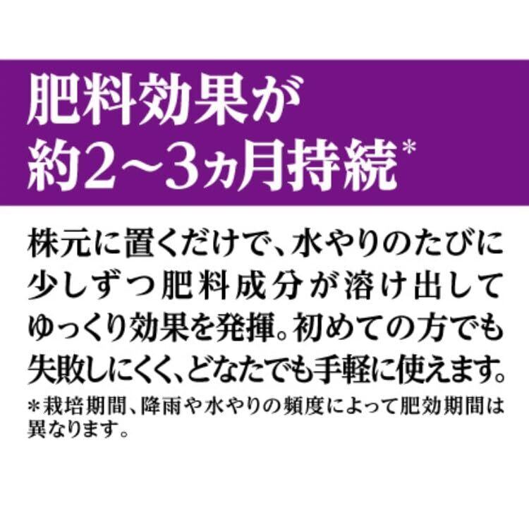株元に置くだけで、水やりのたびに少しずつ肥料成分が溶け出してゆっくり効果を発揮。