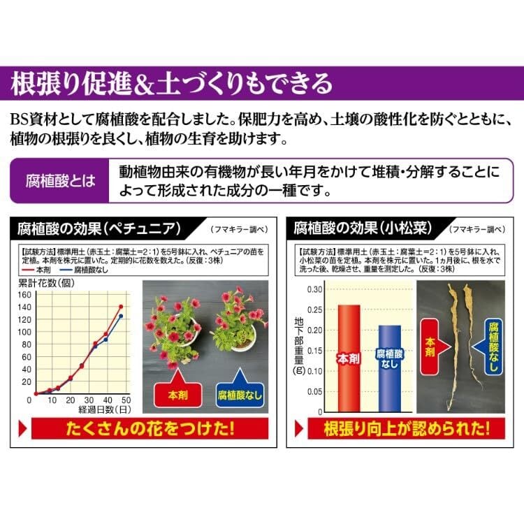 保肥力を高め、土壌の酸性化を防ぐとともに、植物の根張りを良くし、植物の生育を助けます。