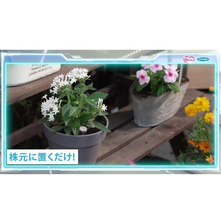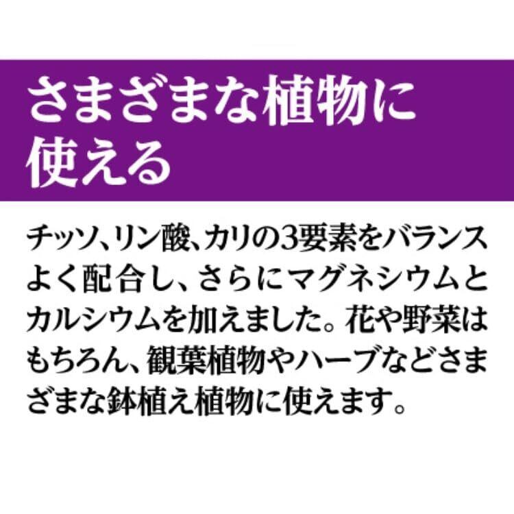 バイオパワーで育ちやすい土壌環境に! 植物を強く、大きく、華やかに!置くだけタブレットタイプ。[肥料タイプ:追肥][生第108895号] ●根張り促進&土づくりもできる バイオスティミュラント資材として腐植酸を配合しました。保肥力を高め、土壌の酸性化を防ぐとともに、植物の根張りを良くし、植物の生育を助けます。 [バイオスティミュラント]とは・・・植物や土壌が持つ本来の力を引き出して、植物の健全な成長を助ける成分や微生物の総称。 [腐植酸]とは・・・動植物由来の有機物が長い年月をかけて堆積・分解することによって形成された成分の一種。 バイオスティミュラント資材について、詳しくはこちら ●肥料効果が約2~3ヵ月持続※ 株元に置くだけで、水やりのたびに少しずつ肥料成分が溶け出してゆっくり効果を発揮。初めての方でも失敗しにくく、どなたでも手軽に使えます。 ※栽培期間、降雨や水やりの頻度によって肥効期間は異なります。 ●さまざまな植物に使える チッソ、リン酸、カリの3要素をバランスよく配合し、さらにマグネシウムとカルシウムを加えました。花や野菜はもちろん、観葉植物やハーブなどさまざまな鉢植え植物に使えます。
