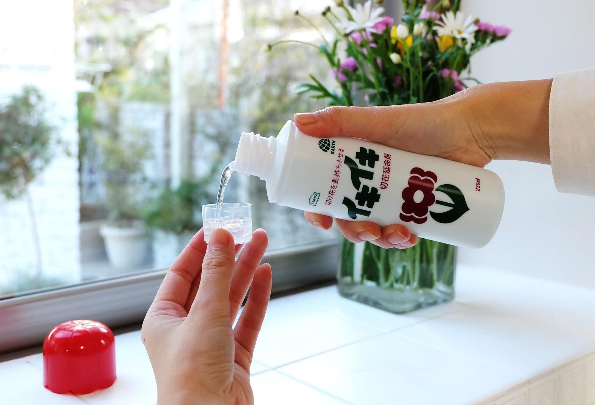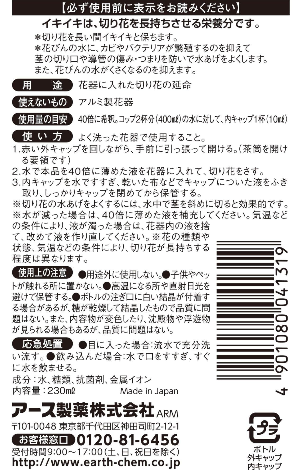 花びんの水をきれいに保つから、切り花がイキイキ長持ち【用途】花器に入れた切り花の延命剤【特徴】・イキイキは、切り花を長持ちさせる栄養分で、切り花を長い間イキイキと保つ・花びんの水に、カビやバクテリアが繁殖するのを抑えて茎の切り口や導管の傷み・つまりを防いで水あげをよくしまた、花びんの水がくさくなるのを抑える・キクの場合は通常、水道水のみに比べて2倍程度は長持ちし(花の種類や本数・使用環境にもよる)、水道水のみでは1~2週間程度の花持ちだが、本剤を使用すると2~4週間程度持つ【注意事項】※よく洗った花器で使用してください。※赤い外キャップを回しながら、手前に引っ張って開けます。※(茶筒を開ける要領です)水で本品を40倍に薄めた液を花器に入れて、切り花をさす。※内キャップを水ですすぎ、乾いた布などでキャップについた液をふき取り、しっかりキャップを閉めてから保管する。※切り花の水あげをよくするには、水中で茎を斜めに切ると効果的です。※水が減った場合は、40倍に薄めた液を補充してください。※気温などの条件により、液が濁った場合は、花器内の液を捨て、改めて液を作り直してください。※花の種類や状態、気温などの条件により、切り花が長持ちする程度は異なります。※用途外に使用しないでください。※子供やペットが触れる所に置かないでください。※高温になる所や直射日光を避けて保管してください。※ボトルの注ぎ口に白い結晶が付着する場合があるが、糖が乾燥して結晶したもので品質に問題はないです。※また、内容物が変色したり、沈殿物や浮遊物が見られる場合もあるが、品質に問題はありません。※目に入った場合:流水で充分洗い流してください。※飲み込んだ場合:水で口をすすぎ、すぐに水を飲ませてください。 原材料・成分 水・糖類・抗菌剤・金属イオン ご注意(免責)>必ずお読みください ご注意(免責)> 必ずお読み下さい。在庫完売の際は、お取寄せ又はキャンセルとなる場合がございます。また、Amazon配送予定日と商品お届け予定日は異なる場合もございますので予めご了承下さい。商品は予告なくパッケージ変更の場合もあります。※お客様都合によるごはお受けできません。 続きを見る