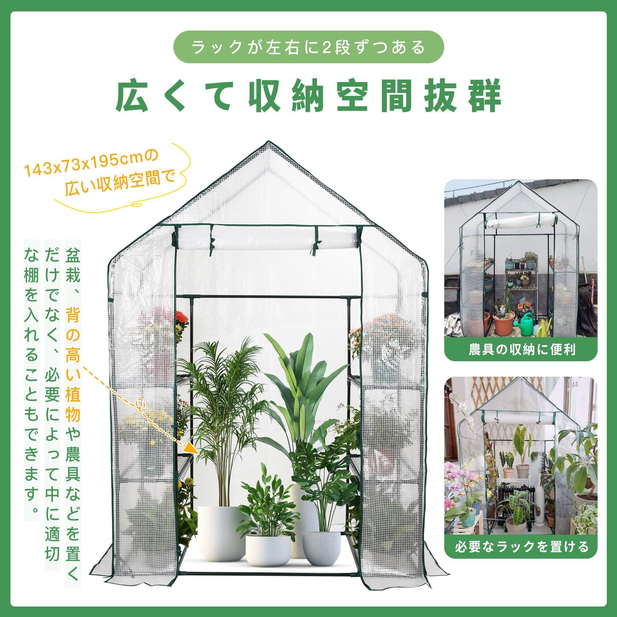 【防雨・防寒・日焼け防止・防虫】このビニールハウスは夏の過度の日焼けや大雨を防げて、冬の防寒保温を行い、異なる季節の需要に適応し、異なる特性の植物に安定した、健康的な生育環境を提供します。さらに、虫や鳥などの啄きも防げて、外部の危険から植物を守ります。