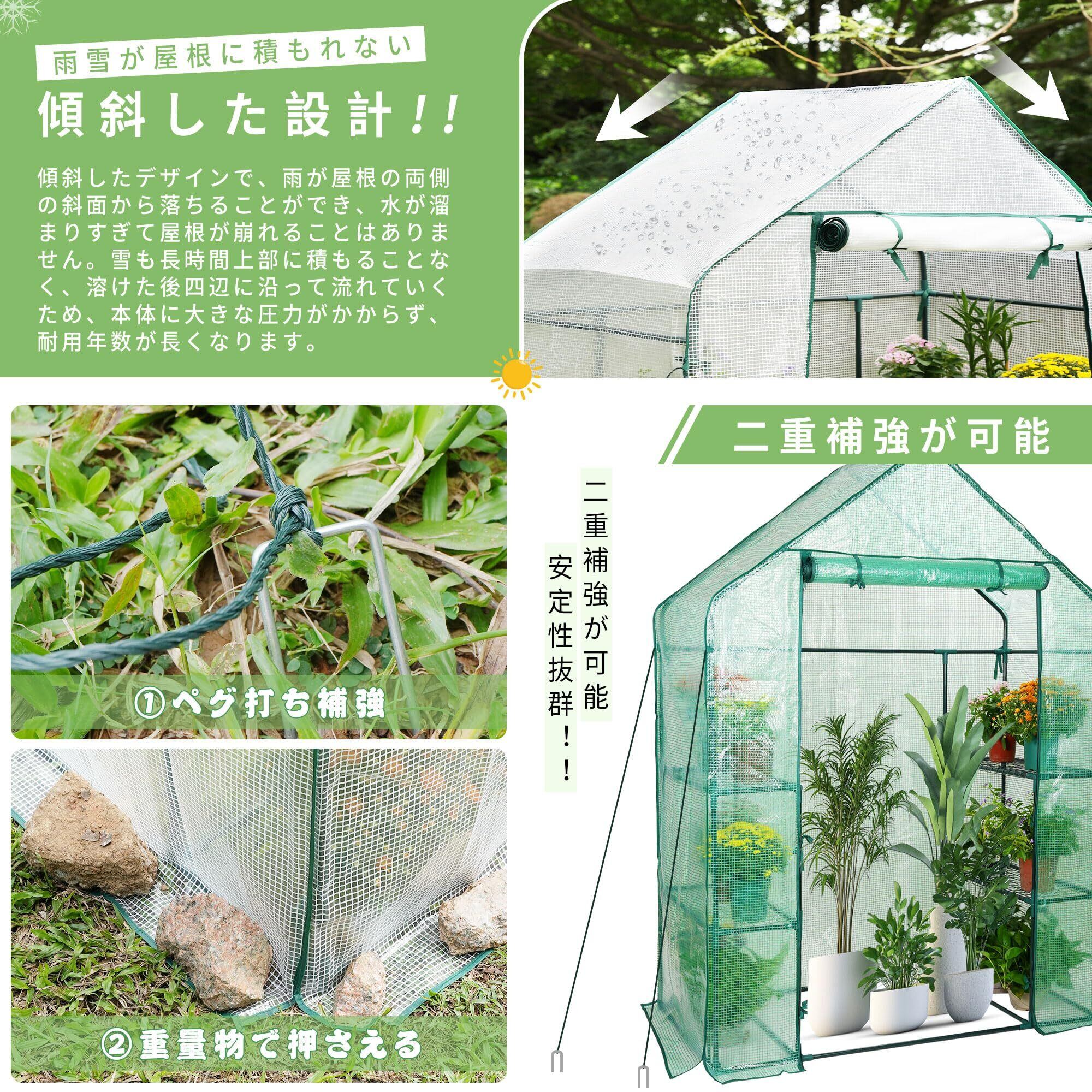 【厚さを増したPE素材のカバー】普通の透明なビニールカバーより、この温室ハウスは保温効果がもっと良くて耐久性も向上します。また、防水率ももっと高くて、大雨に見舞われても水の浸入防止に効果的です。