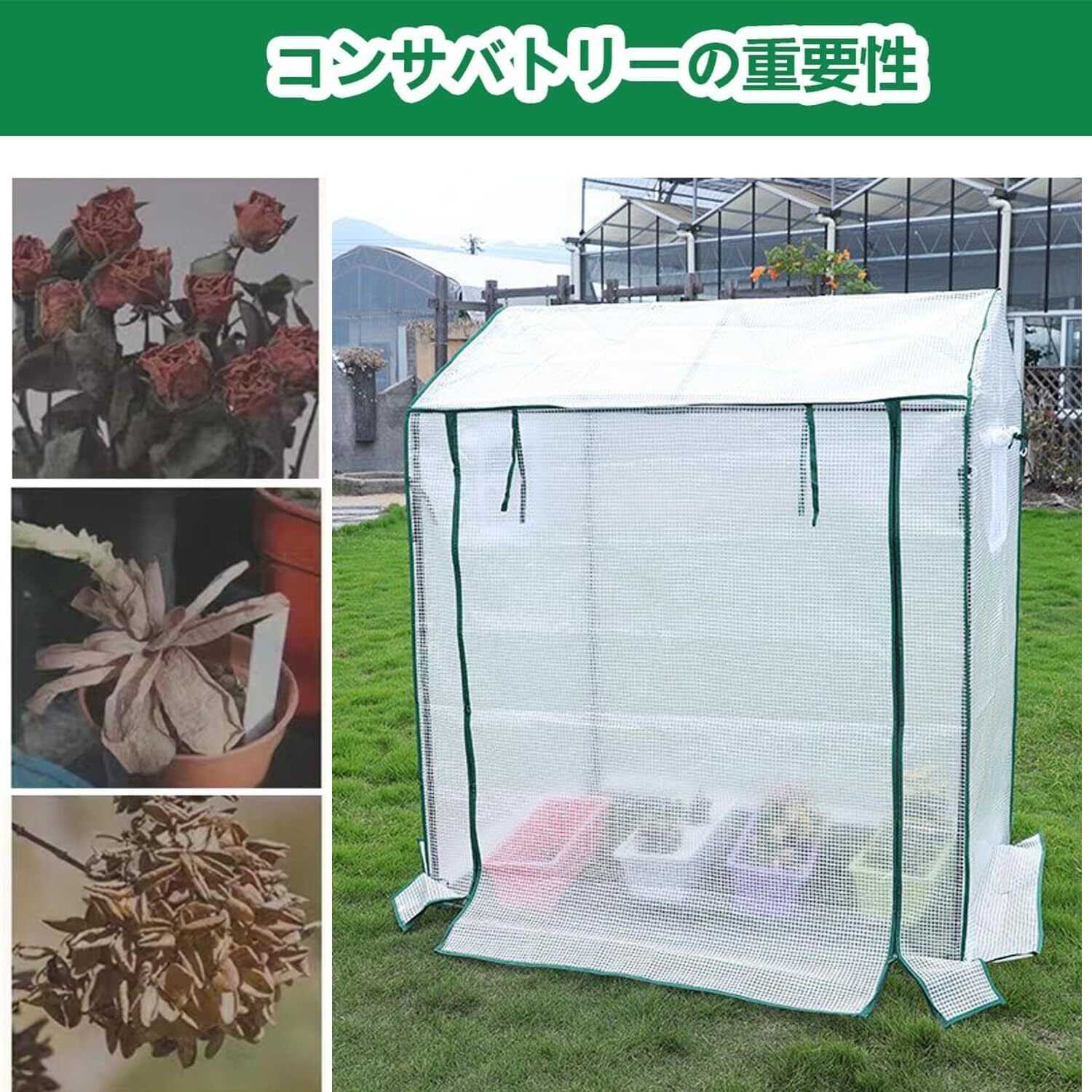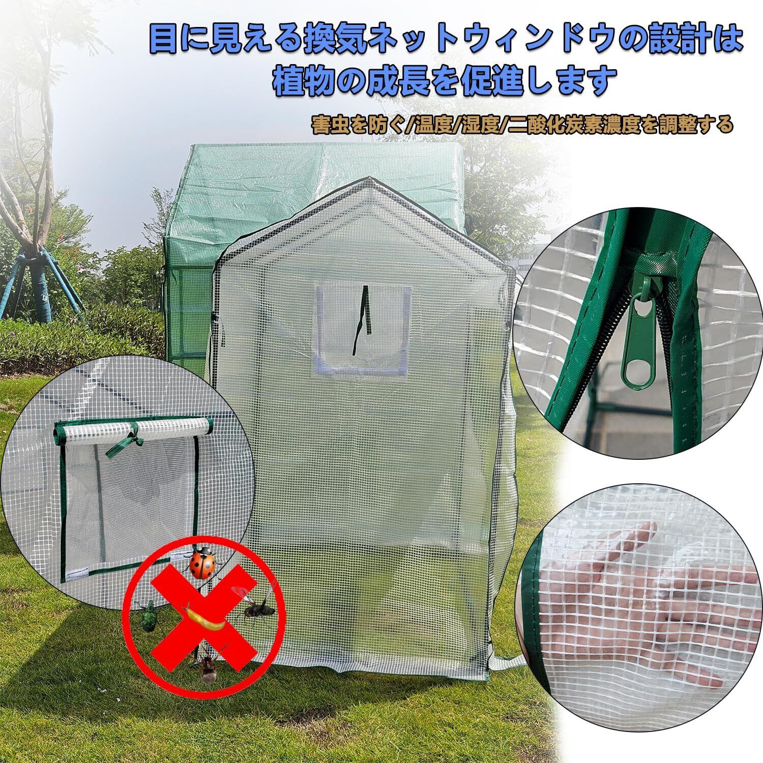 【使いやすさ/組み立て・収納が簡単】このビニールハウス 小型は、開閉可能なジッパーとリボンで温室の扉を固定し、水やりや肥料やり、自由な換気など、作業中も邪魔にならないように設計されています。 また、温室の左右にあるメッシュ窓は、害虫を防ぐためのものです。 両側の窓を巻き上げ、紐で固定すれば、入ってくる風によって温室内の温度や湿度、あるいはCO2濃度を調整でき、植物の生育をより良く促すことができます。ビニールハウス組み立ては簡単、工具不要 付属の説明書に従って、ロッドを取り付けるだけです。 ビニール温室コンパクトに折りたたんで収納でき、場所をとりません。花園温室 、家庭菜園 、小型 ベランダに適用