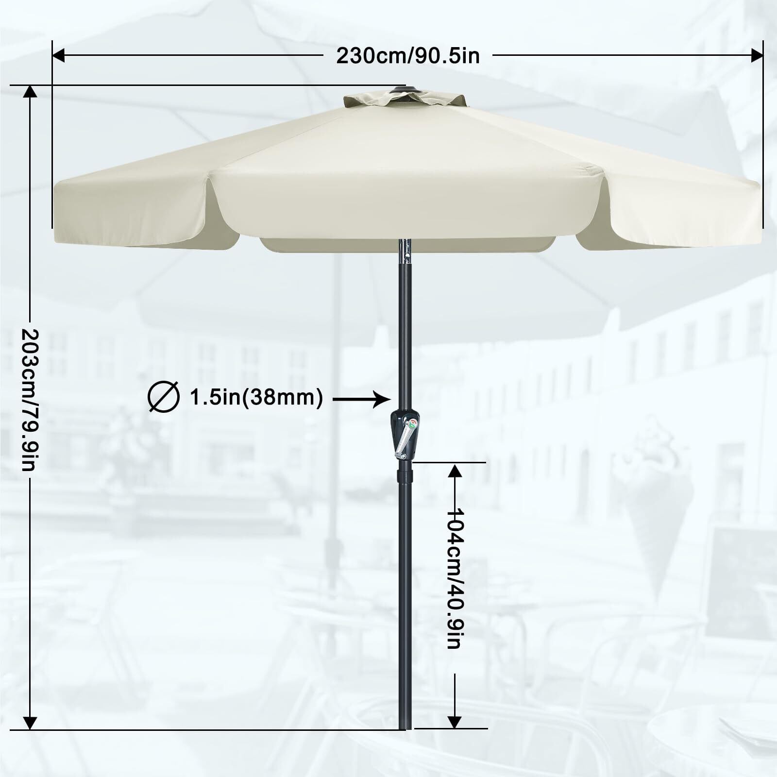 商品仕様:【サイズ】直径230cmx高さ203cm/ポールの直径38mm。【材質】骨組み:合金鋼/生地:ポリエステル。【傘骨】6本。
