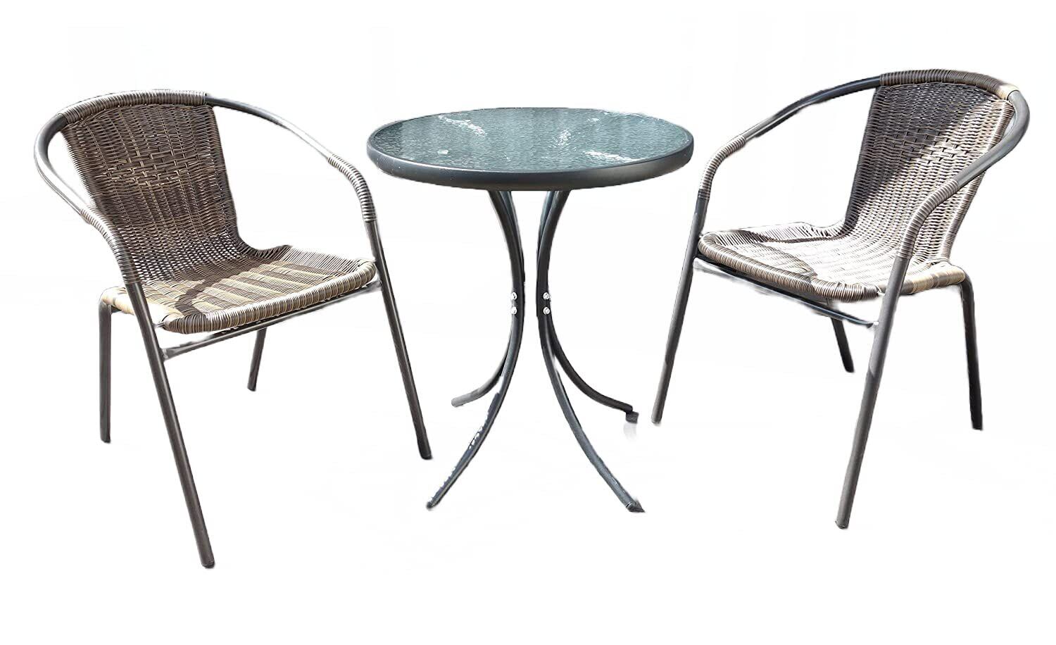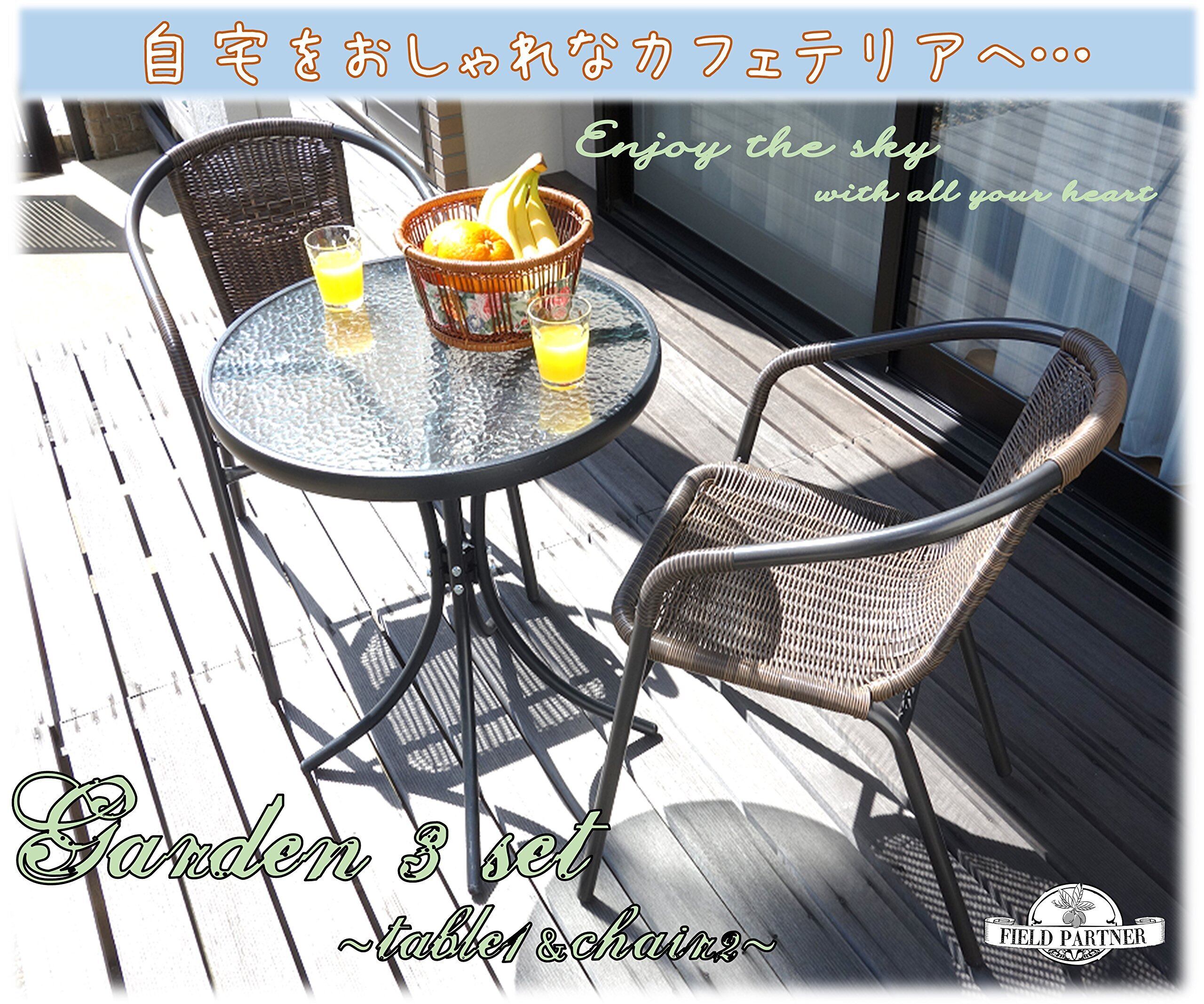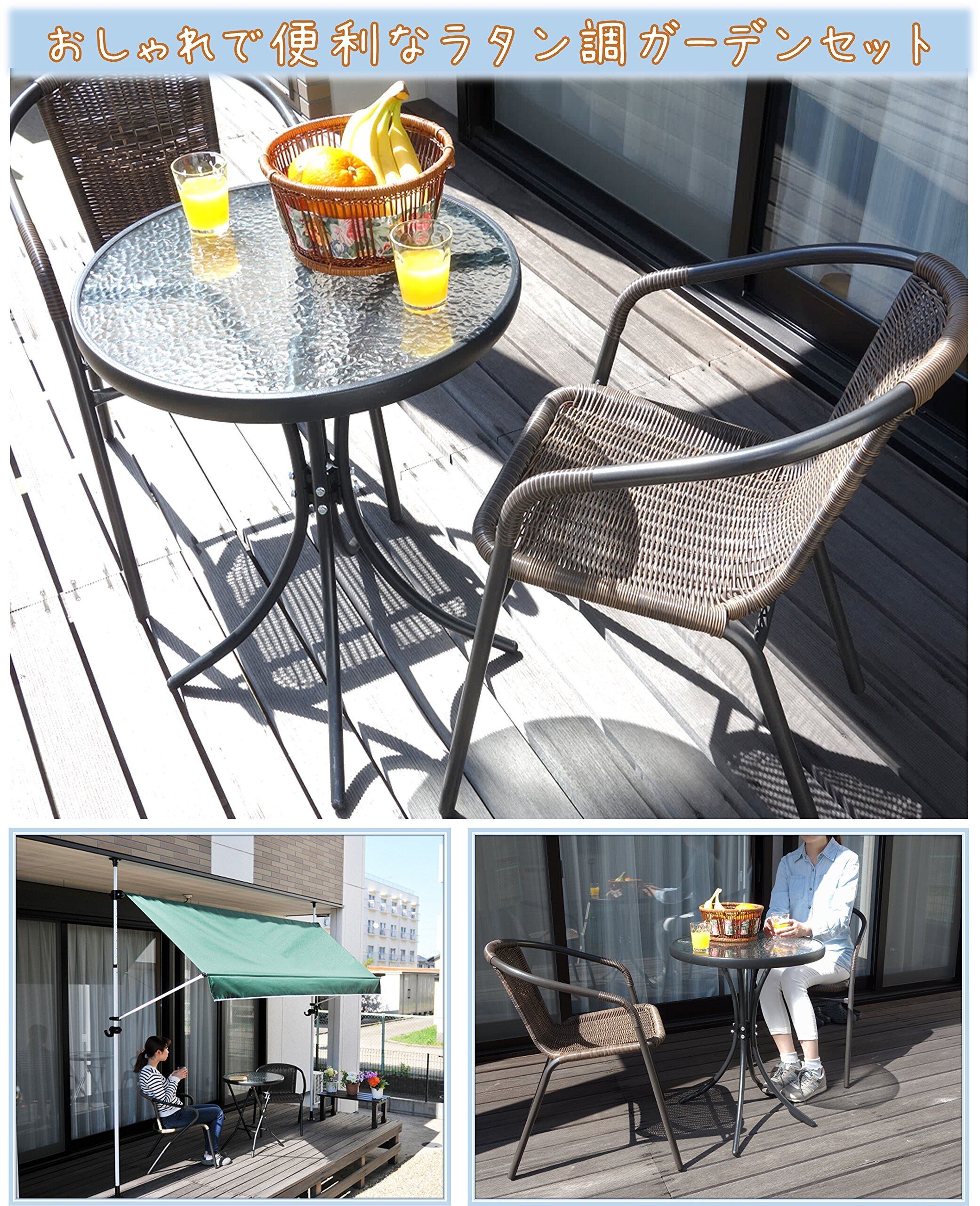 ●ラタン調のオシャレなガーデンファニチャー3点セットがお買い得 ●ガラス天板のテーブルが高級感を演出。本製品を置くだけでベランダやお庭、テラスが一気に華やかに! ●ガラス天板だから、飲み物などをこぼしてしまってもお手入れ簡単。 ●テーブルのみ組立品で組立簡単だから、届いた日からすぐに使えます。 ●チェアは完成品で箱から出すだけ。 ●使わないときは折りたためば椅子をスタッキング(積み重ね)すれば、省スペースで収納ラクラク