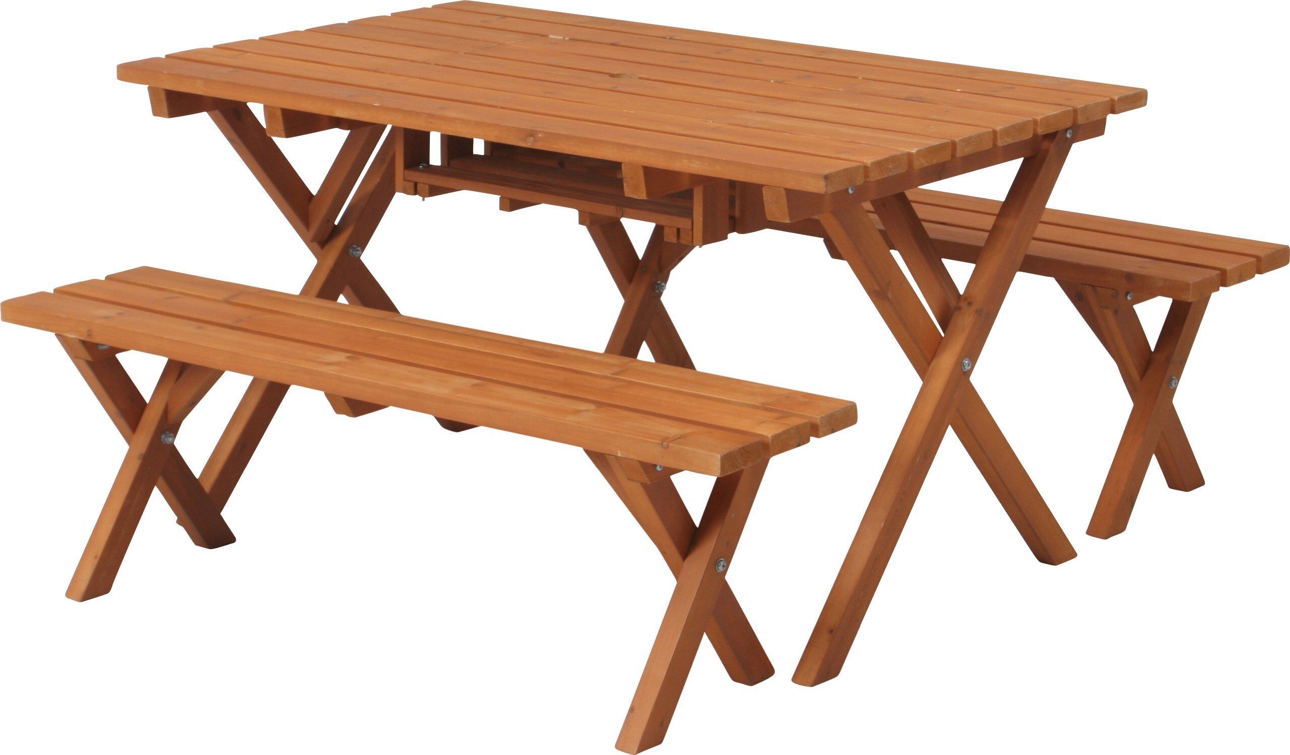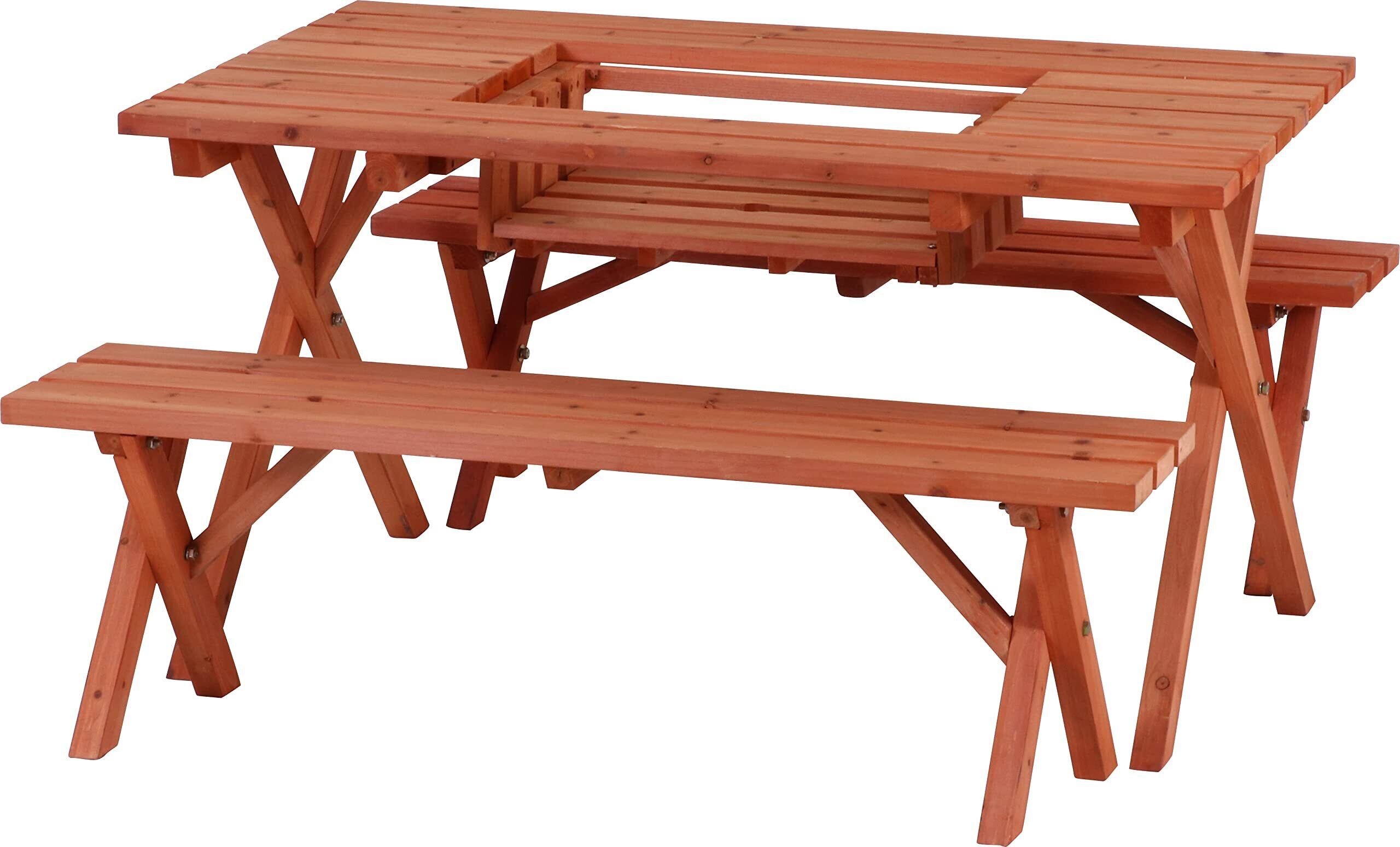 不二貿易 ガーデンテーブルセット BBQテーブル&ベンチセット 幅120×奥行72×高さ65.5cm オレンジ 4人用 コンロスペース付き パラソルホール付き 杉材 81761