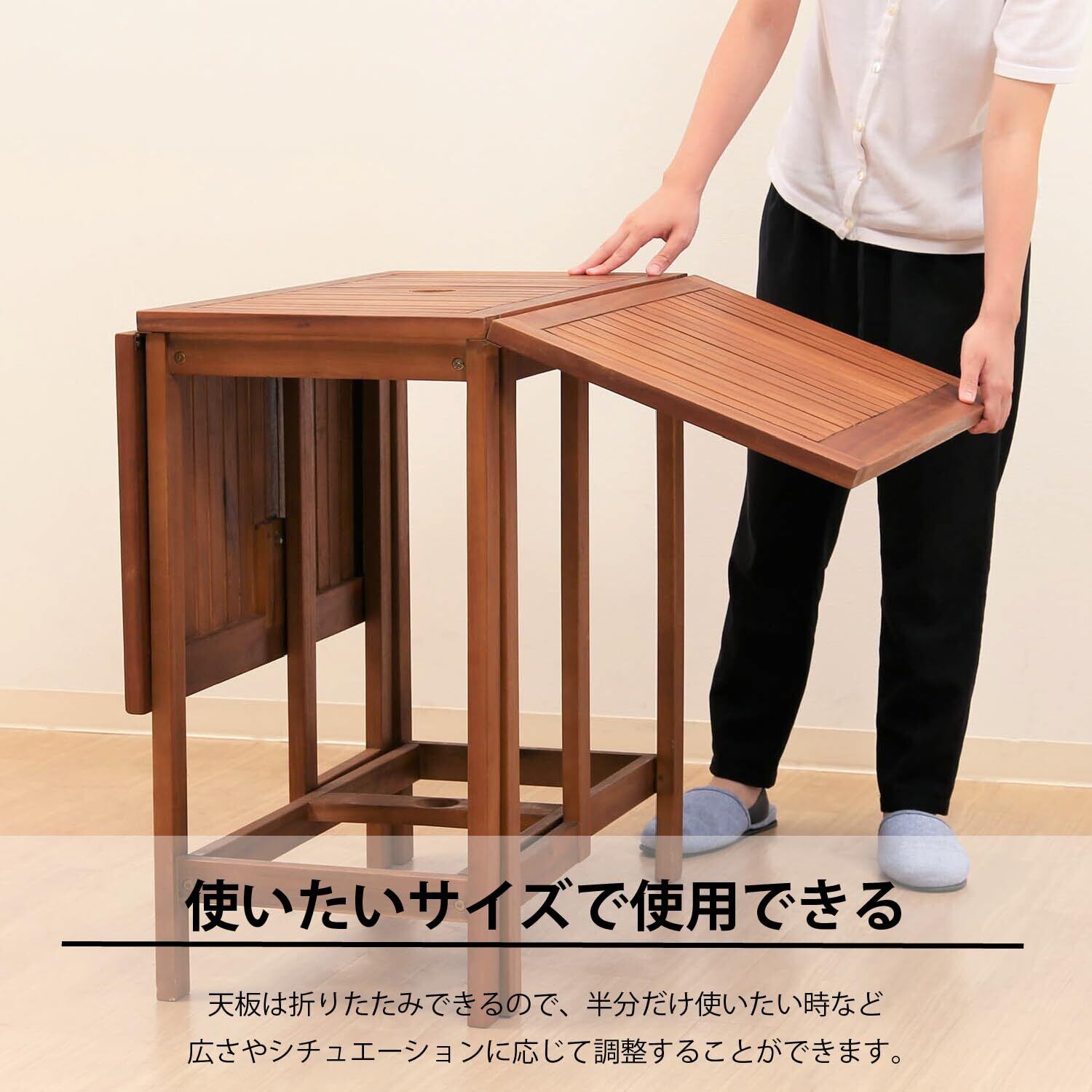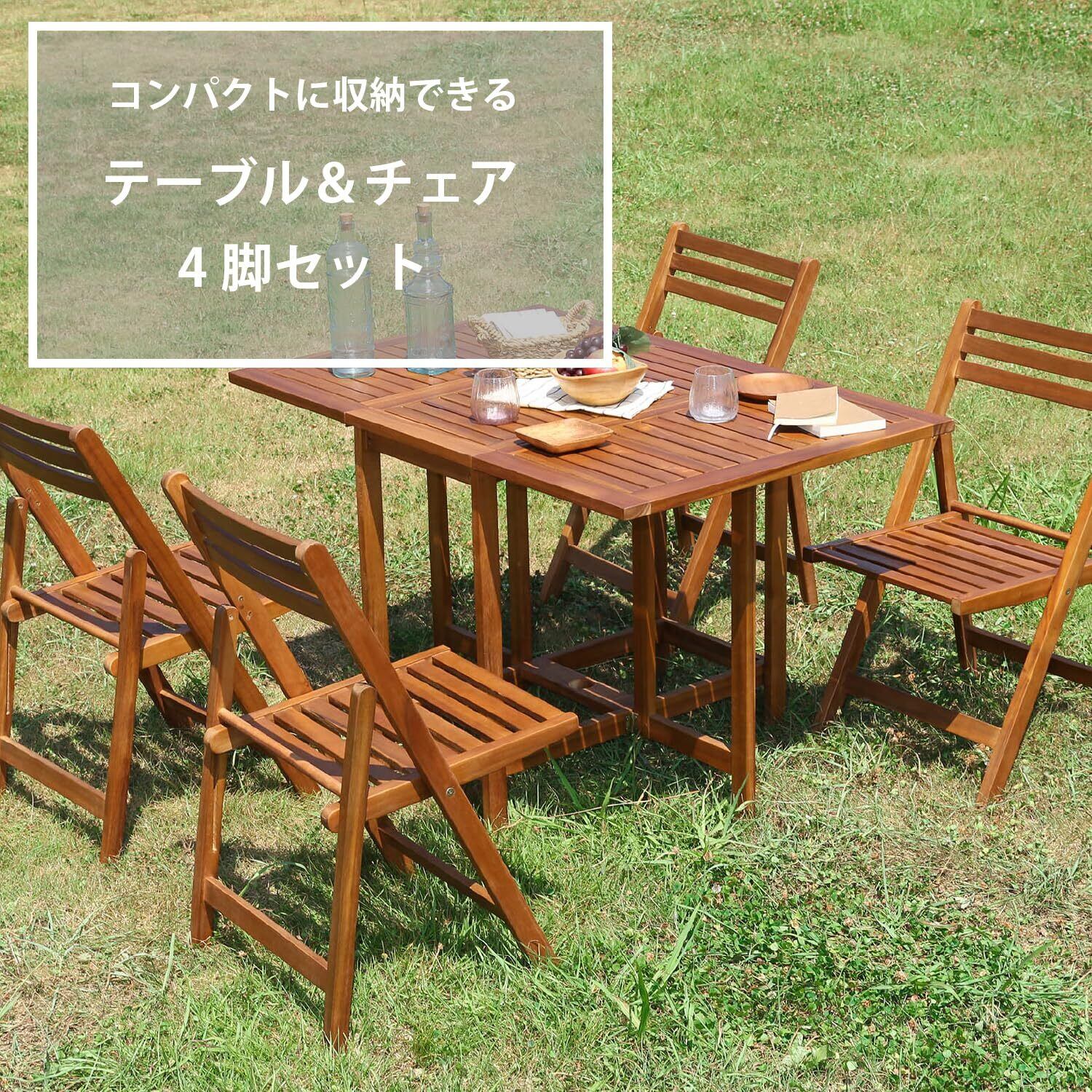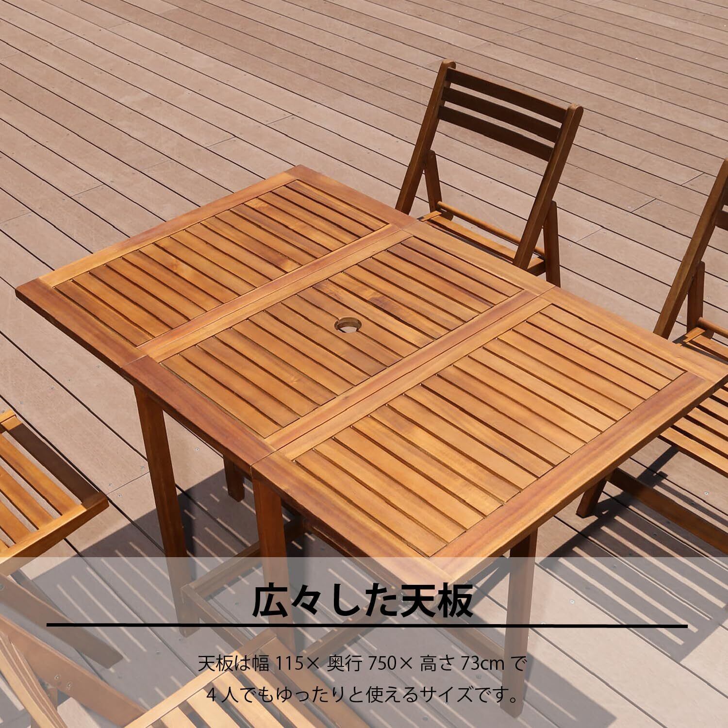 アカシア材の木目の温かみがあるガーデン用のテーブルチェア5点セット バタフライ式天板で4人用としても2人用としても使用できます。 チェアは折りたたんでテーブルに収納することが可能。 サイズ 【テーブルサイズ】幅115.5×奥行75×高さ72cm 【テーブル折りたたみサイズ】幅42×奥行75×高さ72mm 【チェアサイズ】幅39×奥行38.5×高さ80cm 【チェア折りたたみサイズ】幅44×奥行7×高さ90cm 【パラソル穴径】5cm 【必読】パラソルベースとは併用できない構造になっています。「よく一緒に購入されている商品」にパラソルとパラソルベースが表示されている場合がございますが、こちらの商品ご購入いただいても一緒にはご使用いただけませんので、お間違いないようご注意ください。